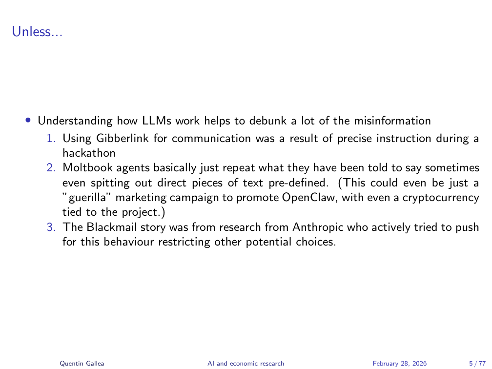 The literature-review agent could search online and read arXiv papers independently. It found and cited additional sources on its own. However — and this is critical — none of the output was fact-checked. The code was not reviewed. The econometrics were not verified. That is part of the experiment: producing the work is now fast, but validating it remains slow and irreducibly human.