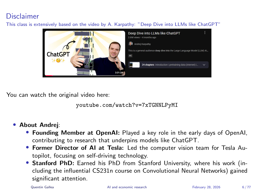 This session is extensively based on Andrej Karpathy’s three-and-a-half-hour video on how LLMs work. Karpathy is a founding member of OpenAI, former Director of AI at Tesla, and a Stanford PhD whose course CS231n became a landmark in deep learning education. He is one of the people who understands LLMs best in the world, and the video is freely available. It is gold. The entire lecture today builds on its content.