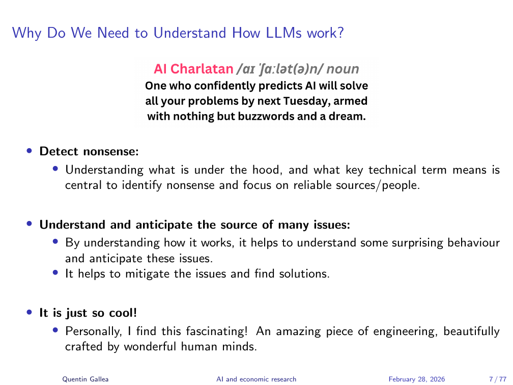 Why invest in understanding the internals? Three reasons. First, to detect nonsense — to distinguish genuine capabilities from LinkedIn hype. Second, to anticipate behaviour — knowing how the system works helps predict where it will succeed and where it will fail. Third, because it is genuinely fascinating.