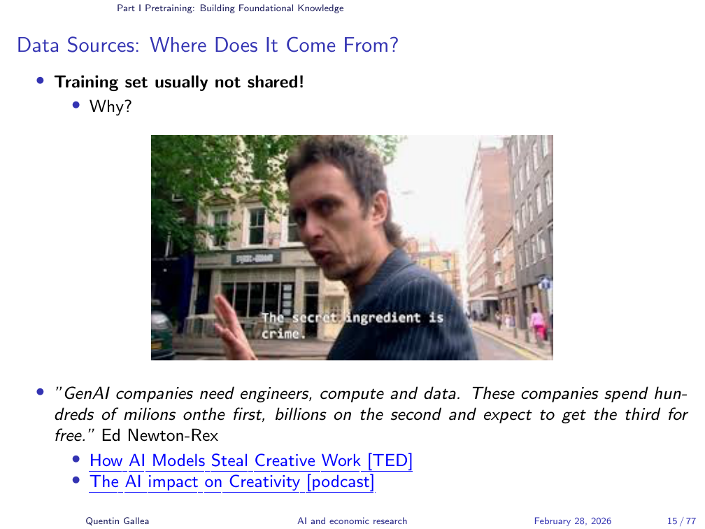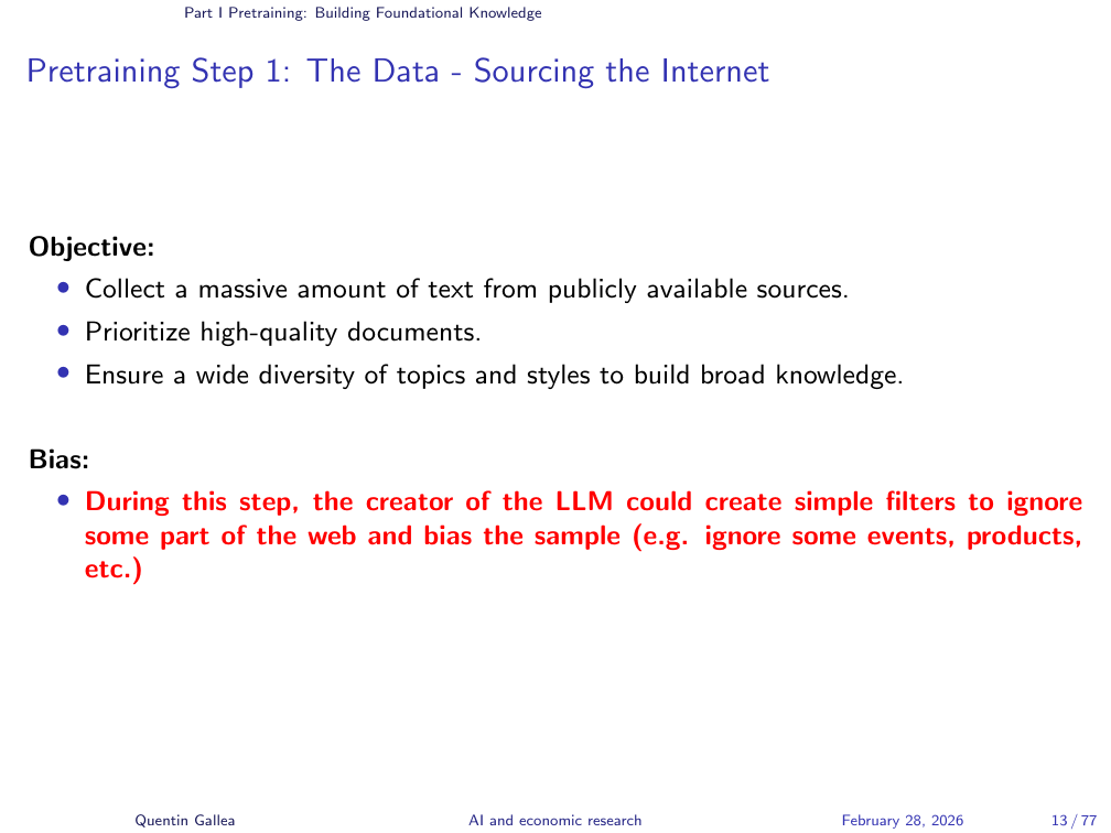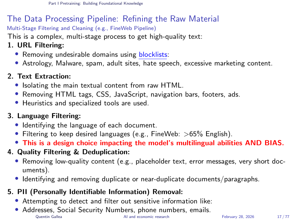 An important point about data curation: even simple filters at this stage can shape what a model “knows.” When DeepSeek was released, numerous examples showed it refusing to discuss Tiananmen Square — a clear case of political filtering. It is easy to criticise China for this, but other models and other companies are certainly doing similar things — the politics in the US these days, as the instructor noted, are not exactly free from such pressures either. At this stage, you can use straightforward tools to exclude entire topics from a model’s knowledge base — effectively making events “disappear.”