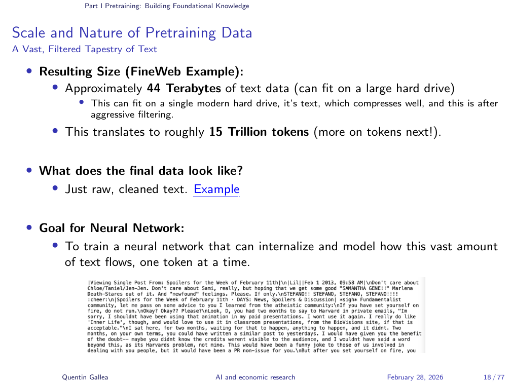 The end result is approximately 44 terabytes of cleaned text — the textual content of most of the internet, fitting on a single large hard drive. What does it look like? A “tapestry of text” — raw prose from news articles, books, Wikipedia entries, forums, and everything in between. You can browse the actual FineWeb dataset online and read the entries yourself.