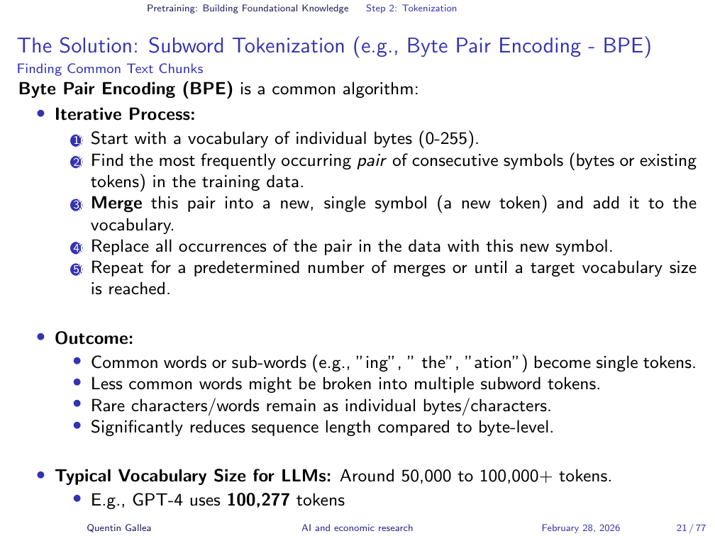 The standard algorithm is Byte Pair Encoding (BPE). It works iteratively: scan the text for the most frequent pair of adjacent elements, merge them into a single token, replace every occurrence in the text, then repeat. Each iteration creates one new token and shortens the overall sequence. Research has shown that the optimal vocabulary size is approximately 100,000 tokens — GPT-4 uses exactly 100,277.