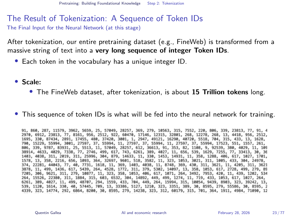 After tokenization, the text becomes a sequence of numerical IDs — and this is what the LLM actually “sees.” Not letters, not words, but token IDs. This explains the famous “strawberry” problem. When people ask “how many Rs are in strawberry?”, the model struggles because it never sees individual letters — it sees tokens like “straw” and “berry.” Counting characters within tokens is not what it was trained to do.