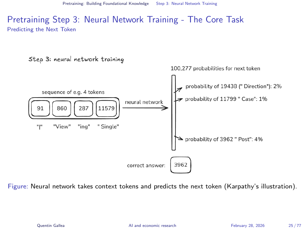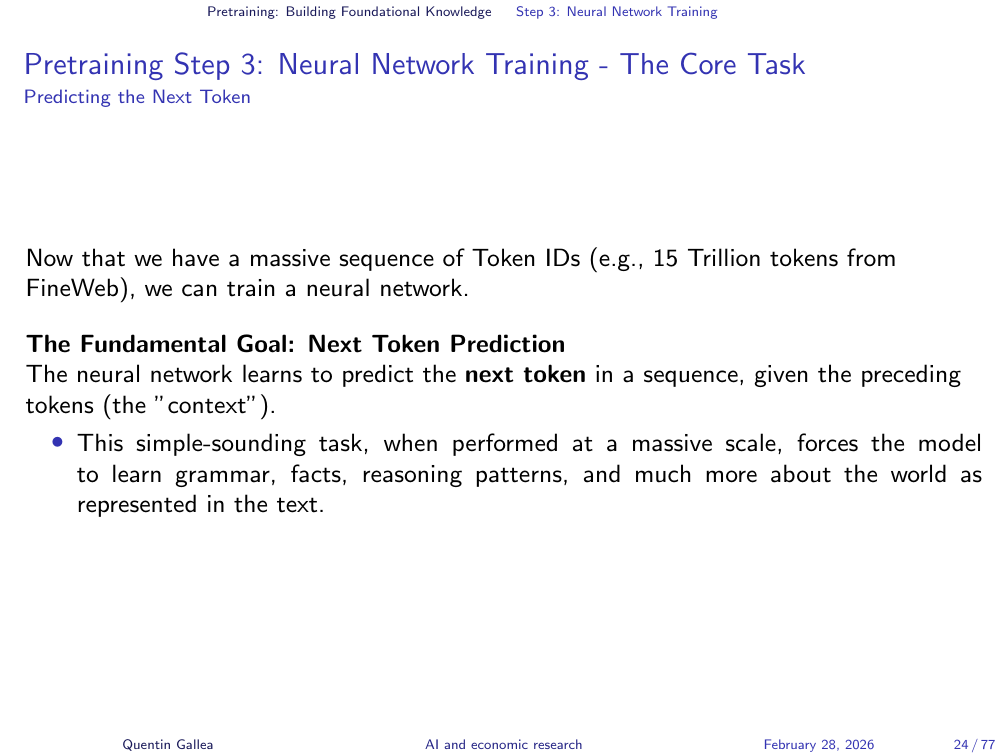 This text is fed into a deep neural network whose task is conceptually simple: predict the next token. Not the next word exactly (as discussed below), but the next unit of text. This is the core of what an LLM learns during pretraining — the statistical patterns of language at an enormous scale.