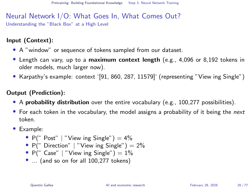 With tokenized text in hand, the core training task is simple to describe: given a sequence of tokens, predict the next one. The input is a sequence like “view in single” and the neural network must assign probabilities across the entire vocabulary of 100,000 tokens for what comes next.
