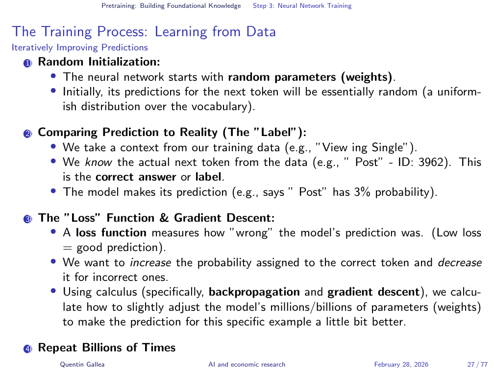 This process — present tokens, predict the next one, compare to the true answer, adjust weights — is repeated billions of times across the entire training corpus. It is the computational heavy lifting of LLM development: enormously time-consuming and energy-intensive, but conceptually straightforward.