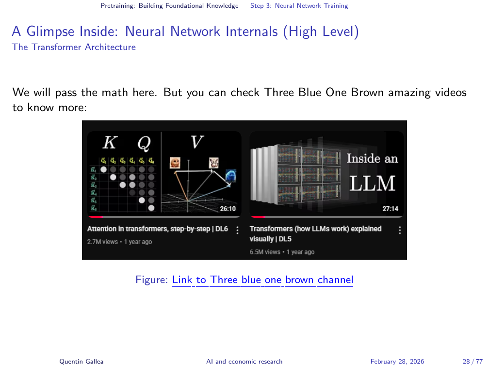 The mathematical details of how weights are updated — backpropagation and gradient descent — are covered beautifully in the 3Blue1Brown videos. Two videos in particular explain the Transformer architecture and the attention mechanism. These are recommended viewing for anyone wanting to go deeper.