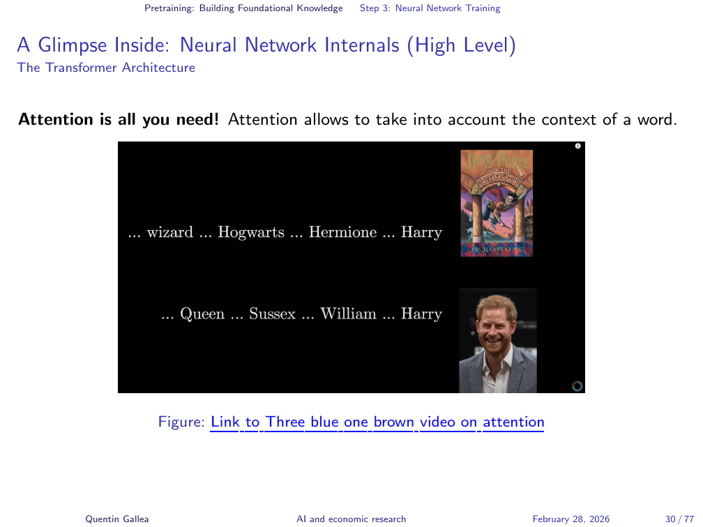 The core idea of attention: to predict the next token well, the model needs to understand context — not just the immediately preceding tokens, but relationships across the entire input. Consider the name “Harry.” In one context, it evokes a wizard with a lightning-bolt scar; in another, a member of the British royal family. The attention mechanism allows the model to look across the full text and identify which distant tokens are relevant to the current prediction.