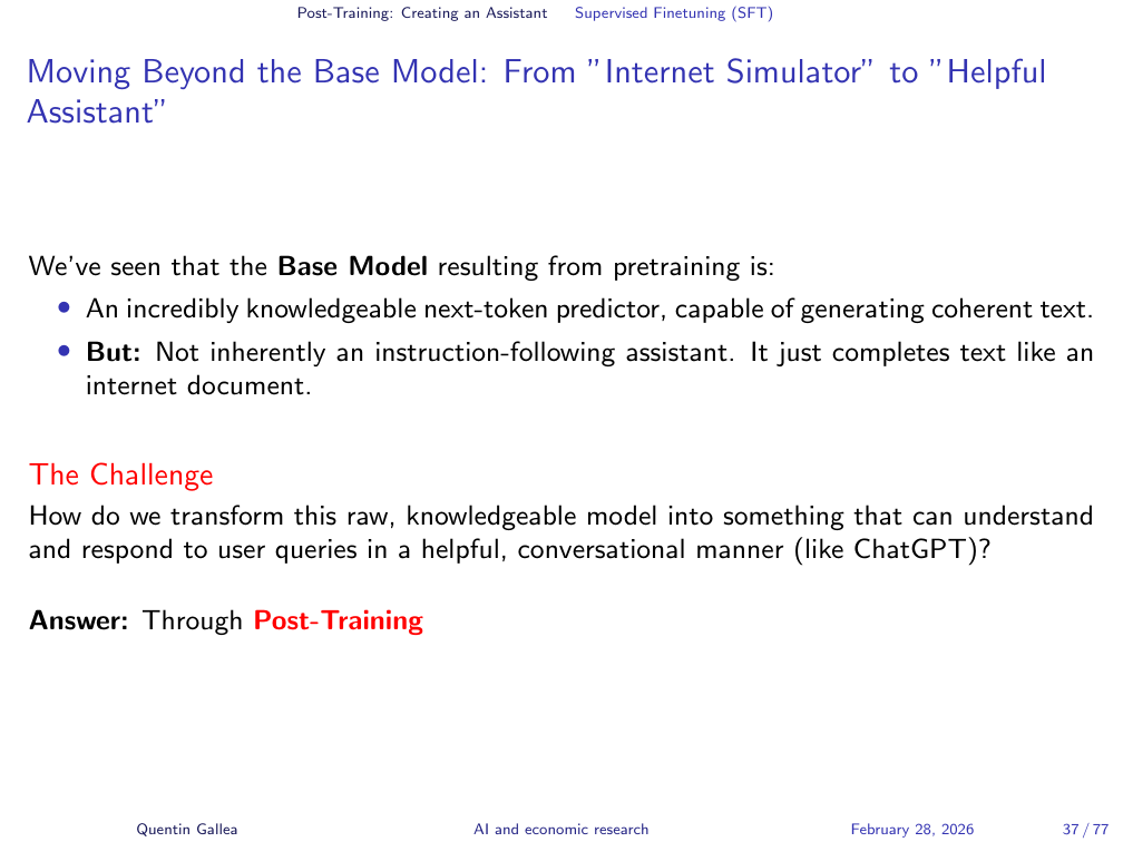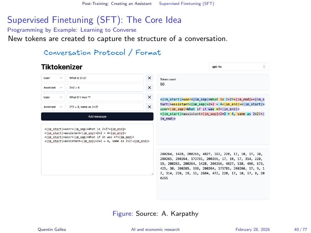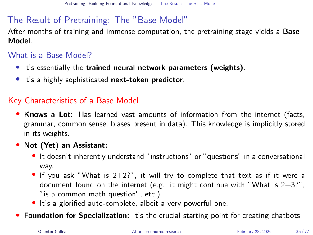 This base model is not conversational. If you type “what is 2 plus 2,” it does not reliably answer “4.” Instead, it might continue with “what is 2 plus 3” or “these are common questions in math” — because it is simulating what might appear next on a web page, not answering a question. As Karpathy puts it, it is “a very, very expensive autocomplete.”