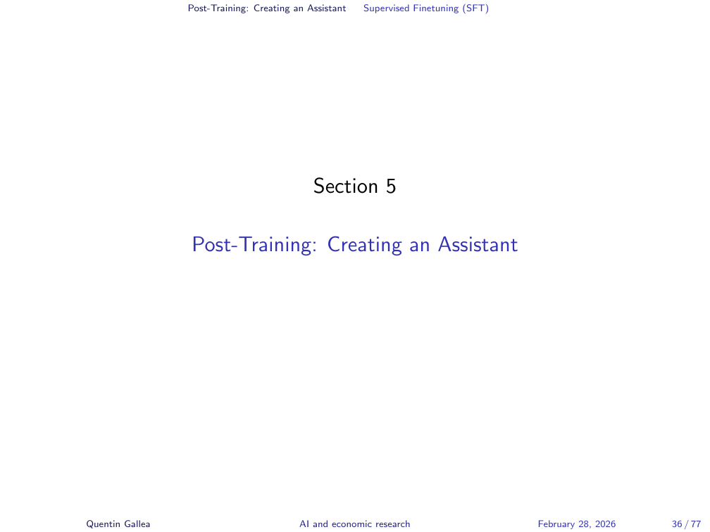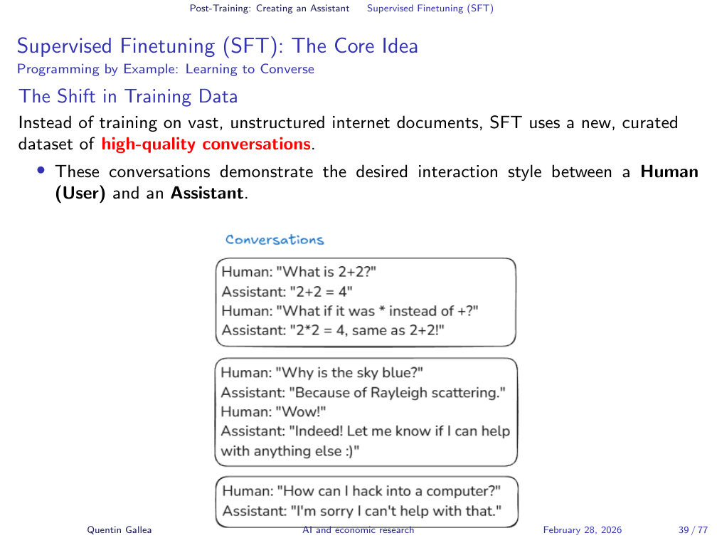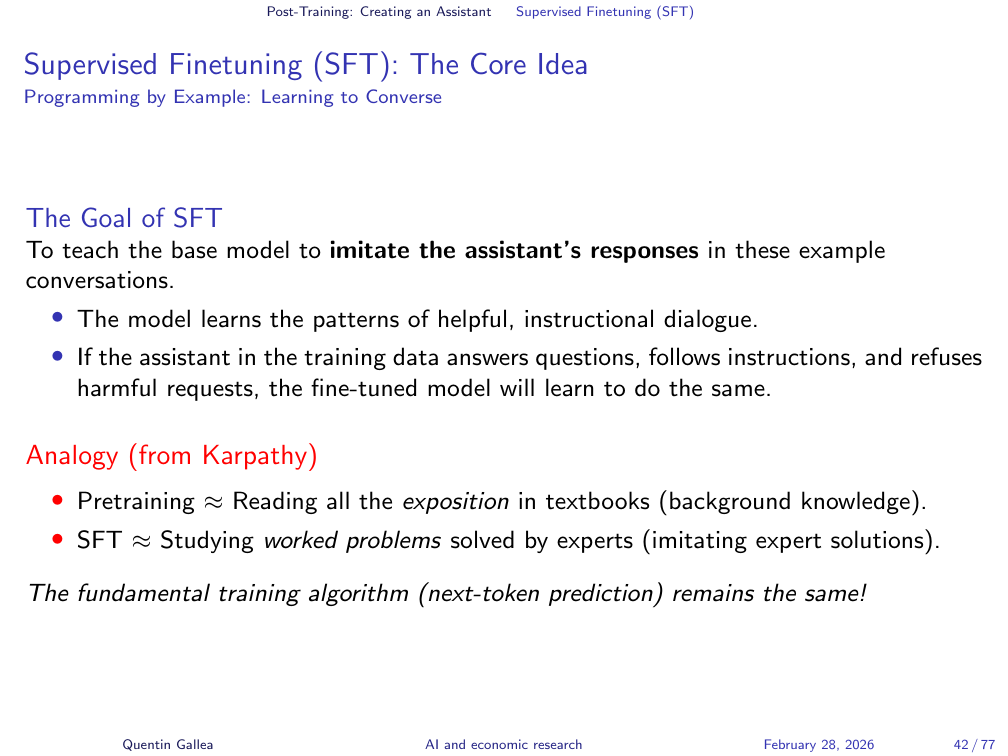 The goal of SFT is to teach the base model to imitate the assistant’s responses in these example conversations. If the assistant in the training data answers questions, follows instructions, and refuses harmful requests, the fine-tuned model will learn to do the same. Karpathy’s analogy: pretraining is reading the textbook exposition; SFT is studying worked problems solved by experts. The fundamental training algorithm — next-token prediction — remains the same.