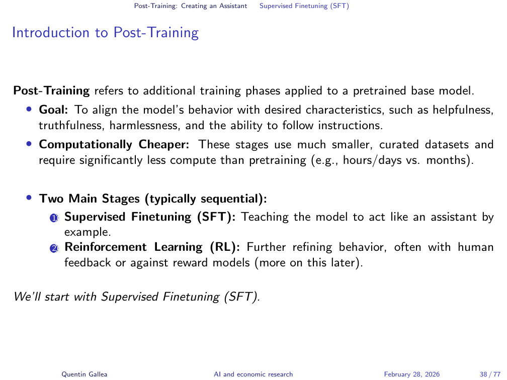The challenge is to transform “glorified text completion” into a helpful assistant. Post-training is computationally cheaper than pretraining — still expensive, but the heavy lifting is done. Two main stages follow: supervised finetuning (SFT) and reinforcement learning (RL).