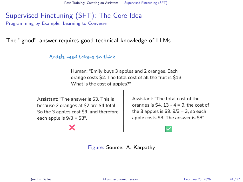 Writing the “good” assistant answer requires genuine technical knowledge. The quality of the SFT dataset depends directly on the expertise of the human labellers who create these example conversations.