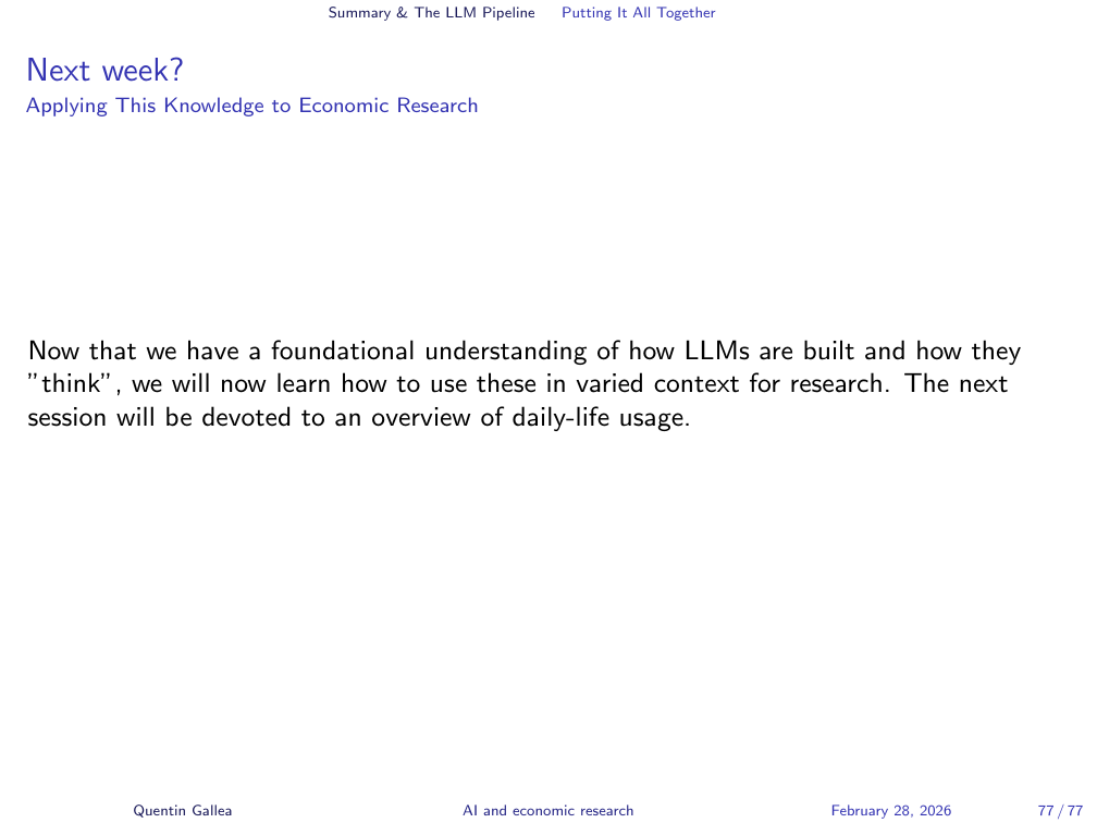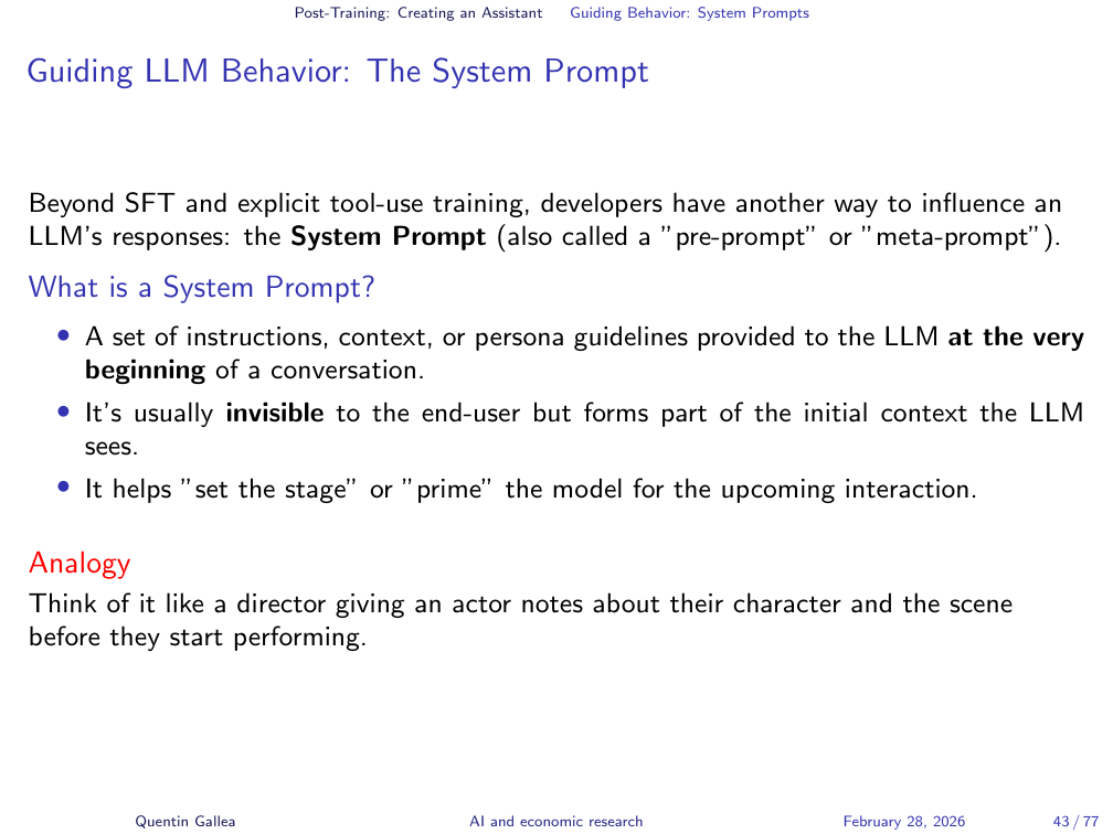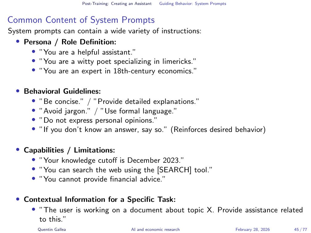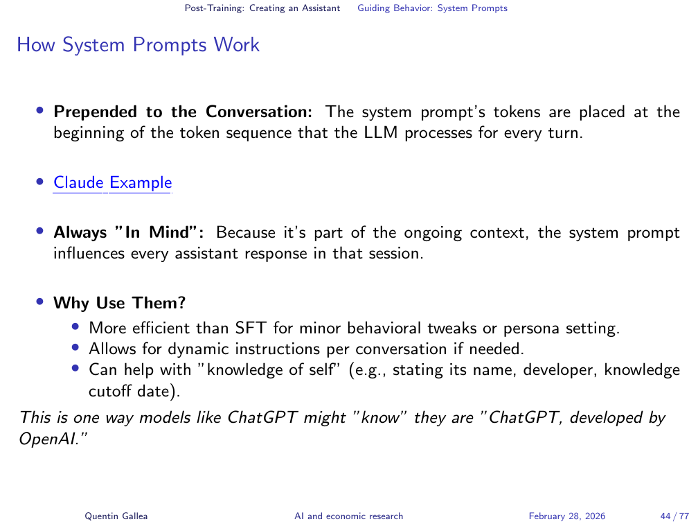 Homework for next week: read Claude’s system prompt (available online). It is essential background for understanding how the tools we use every day are configured.