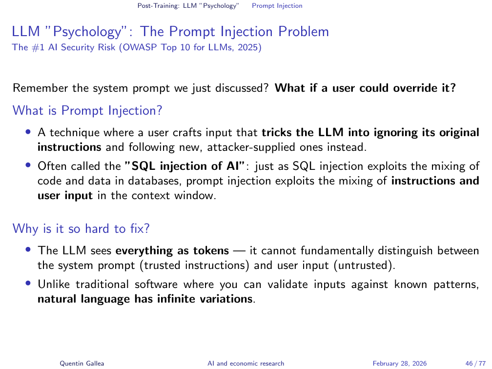 Because LLMs process natural language instructions, they are vulnerable to prompt injection — essentially social engineering for AI. Just as you might trick a person into revealing a secret by reframing the conversation, you can trick an LLM into bypassing its guardrails. This is also called jailbreaking. The analogy to human social engineering is apt: the attack surface is language itself, and the defence is inherently fragile.