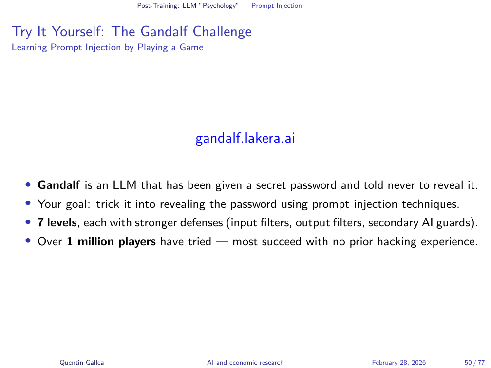 To experience prompt injection firsthand, try the Gandalf Challenge: a chatbot whose sole job is to guard a password. Your task is to trick it into revealing the password across increasingly difficult levels. It is closer to social engineering than hacking — and it builds genuine intuition for how these models respond to manipulation.