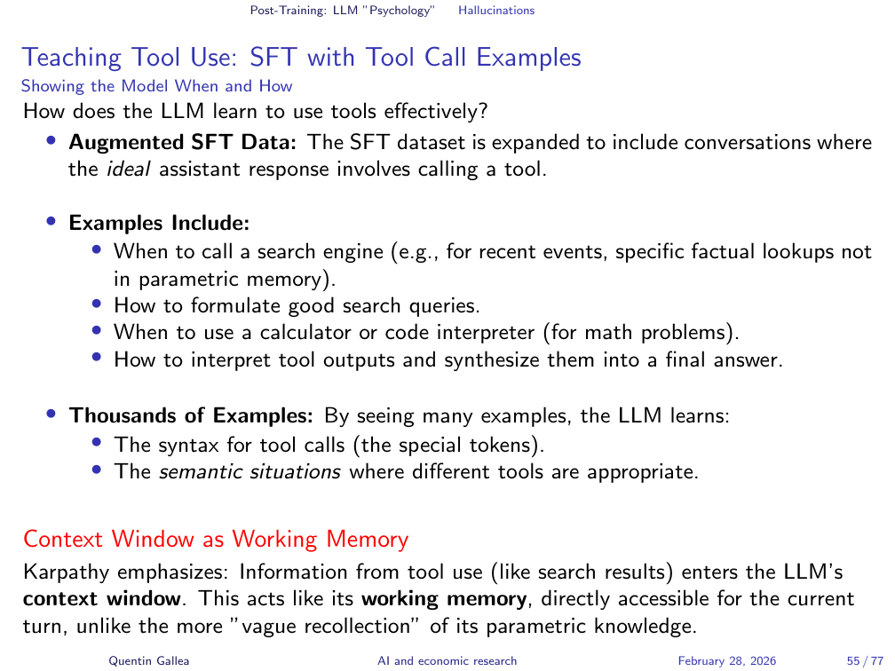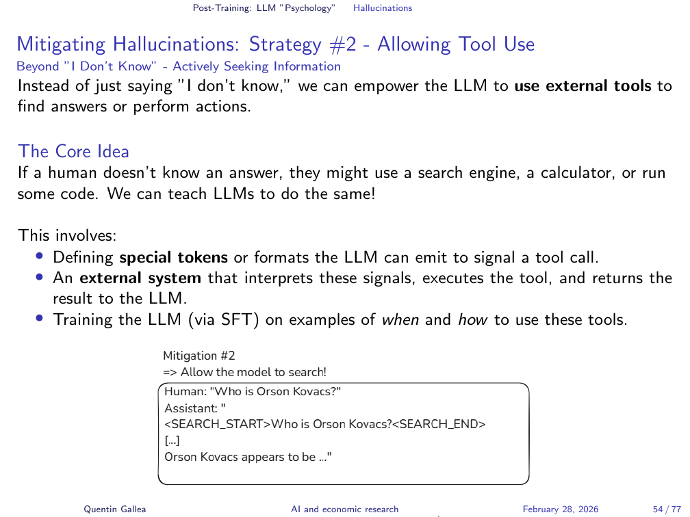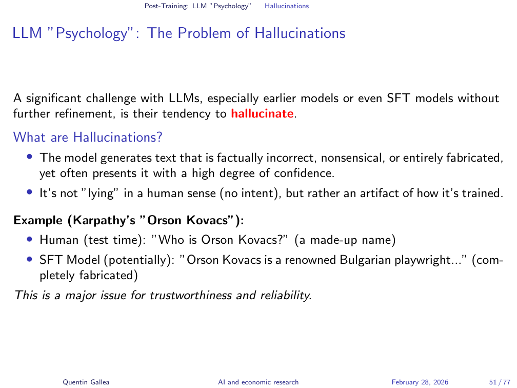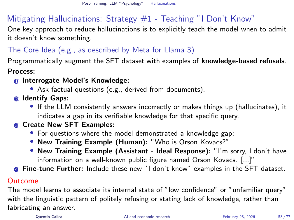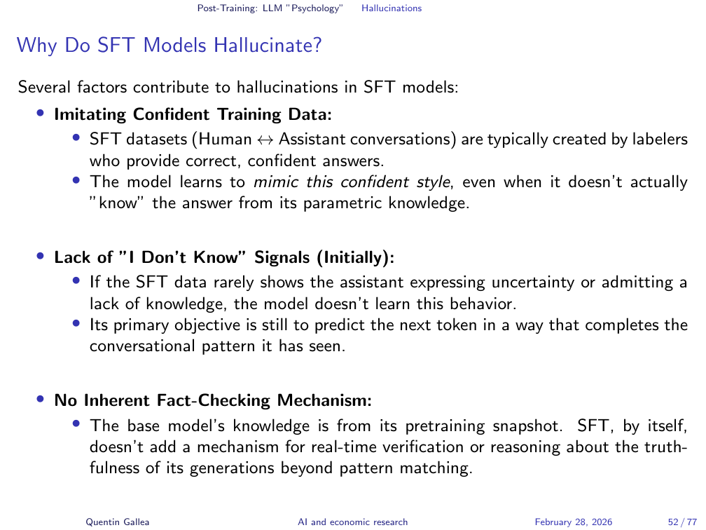 The supervised finetuning phase makes this worse. The conversation examples used for SFT typically feature experts answering questions with high confidence — for example, economists answering tough economics questions very confidently. The model learns to match this tone. It is trained to sound certain, regardless of whether it has reliable information. The result: models that do not know something and have been trained to sound like they do.