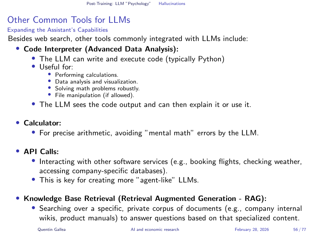 Beyond web search, other tools commonly integrated with LLMs include: Code Interpreter for calculations, data analysis, and visualization; Calculator for precise arithmetic; API calls for interacting with external services (booking, weather, databases); and Knowledge Base Retrieval (RAG) for searching over private document collections. These tools are key to creating more capable, “agent-like” LLMs.