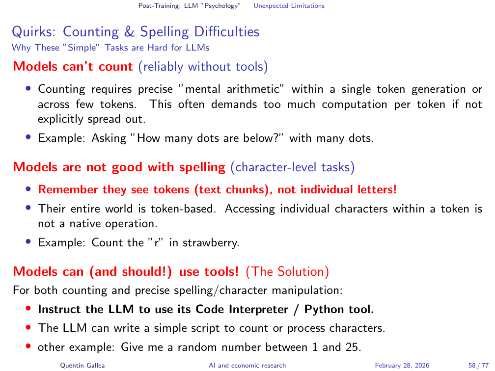 - LLMs do not see words or letters — they see tokens. This explains many quirks (counting Rs in “strawberry,” generating non-random “random” numbers) and points to the fix: delegate precision tasks to code.