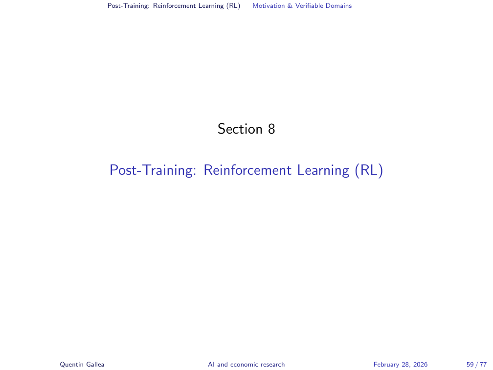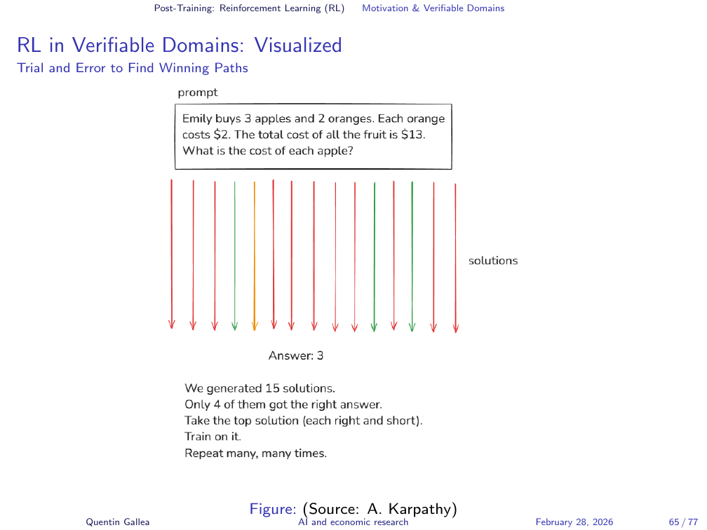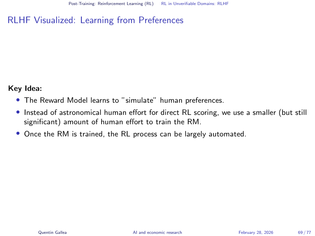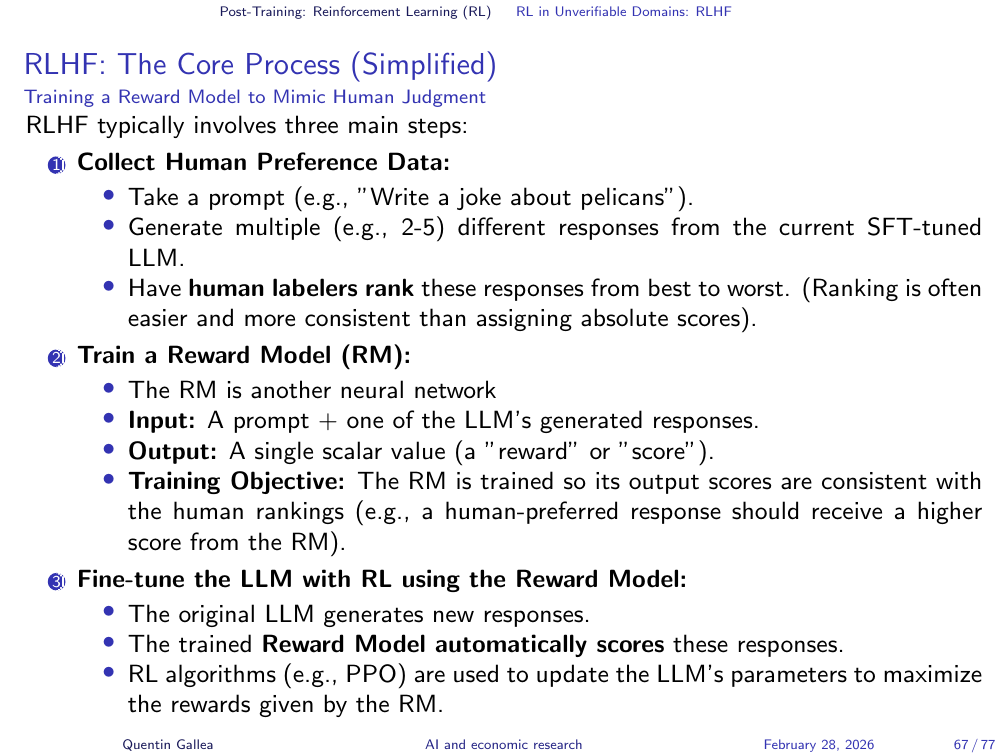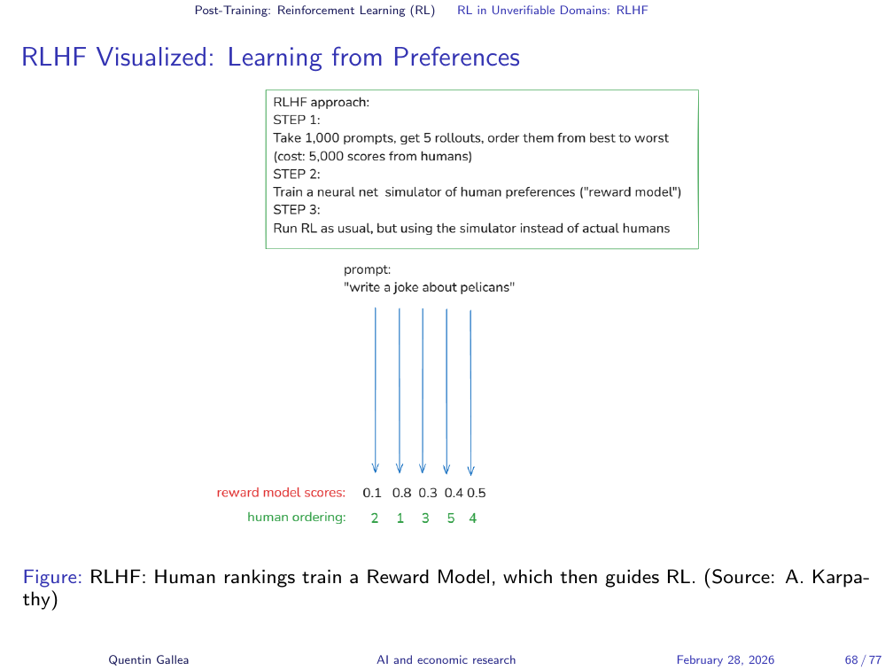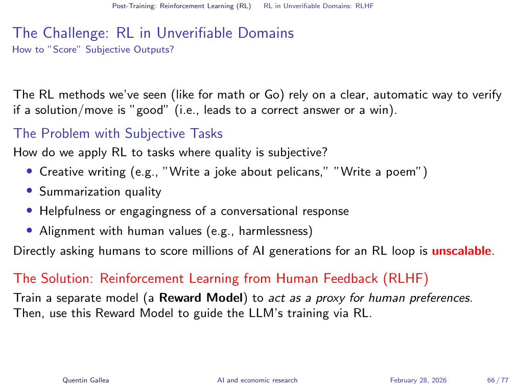 But what about domains where there is no objectively correct answer? Most of what we care about in research — writing quality, explanatory clarity, rhetorical choices — has no formal verification function. This is where a different flavour of reinforcement learning enters.