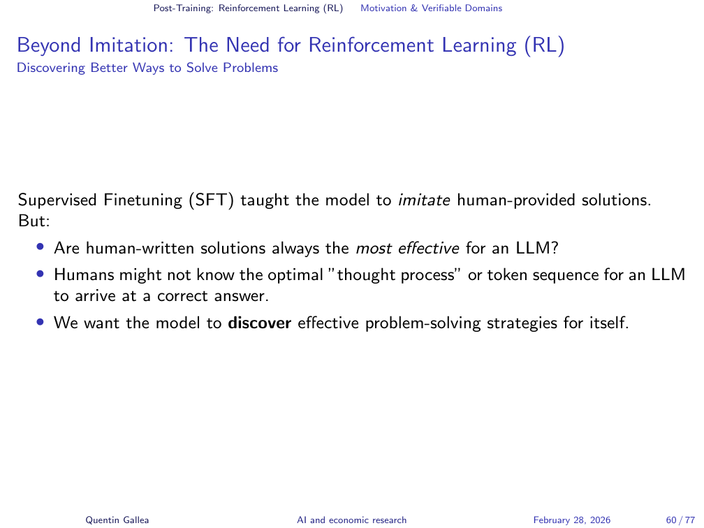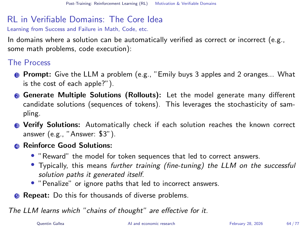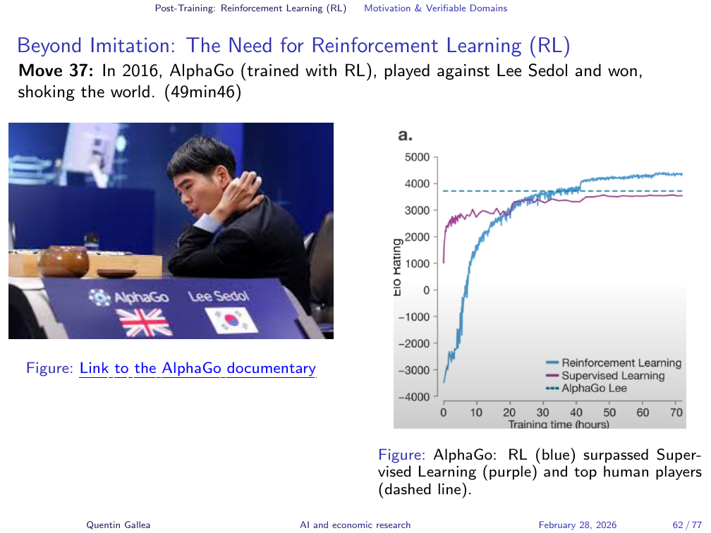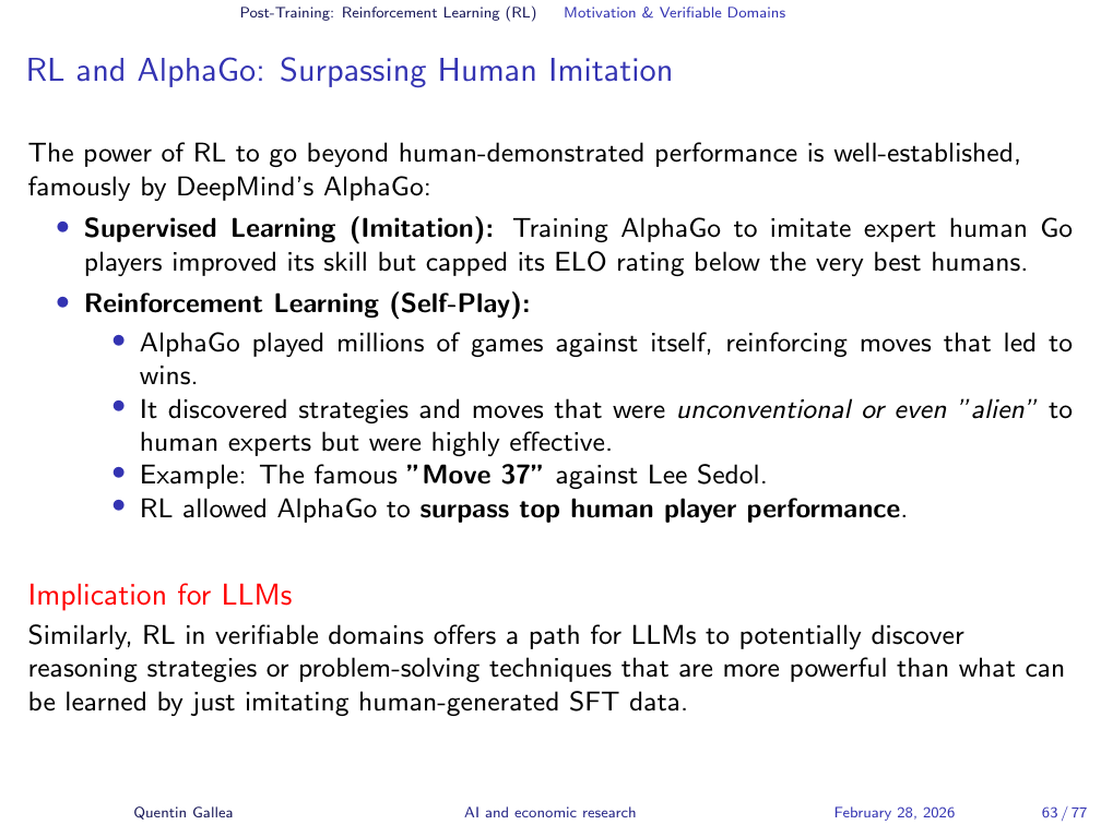 - Reinforcement learning in verifiable domains can surpass all human expertise (AlphaGo’s Move 37). In unverifiable domains, RLHF approximates human preferences — but at real human cost.