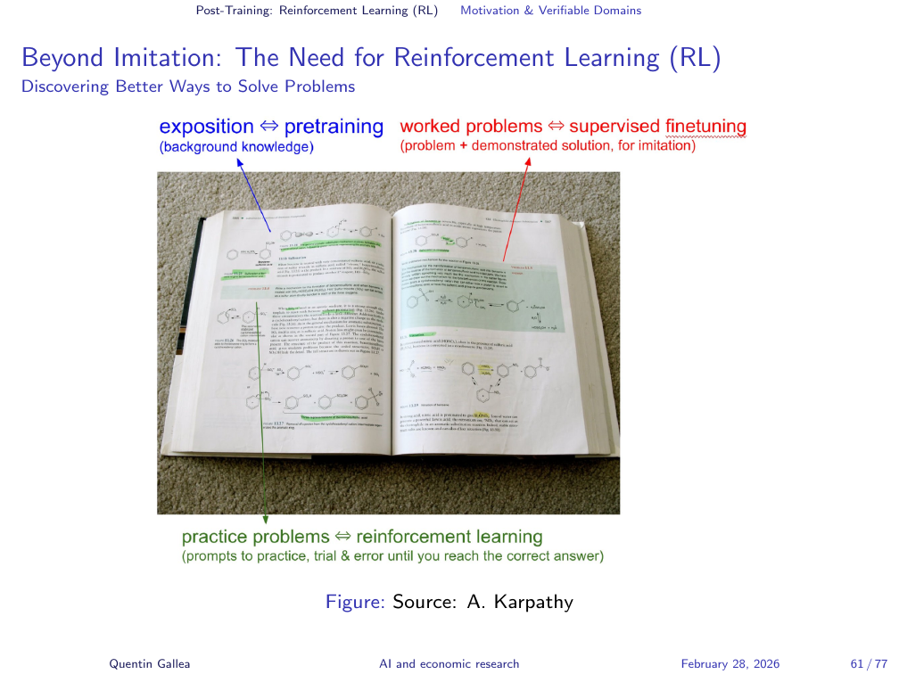 Karpathy’s analogy captures the three training phases precisely. Pretraining is reading the textbook — absorbing facts and exposition. Supervised finetuning is studying worked problems with solutions — observing how experts solve specific tasks. Reinforcement learning is attempting new problems on your own — trying, failing, discovering novel strategies, without seeing the solution path.