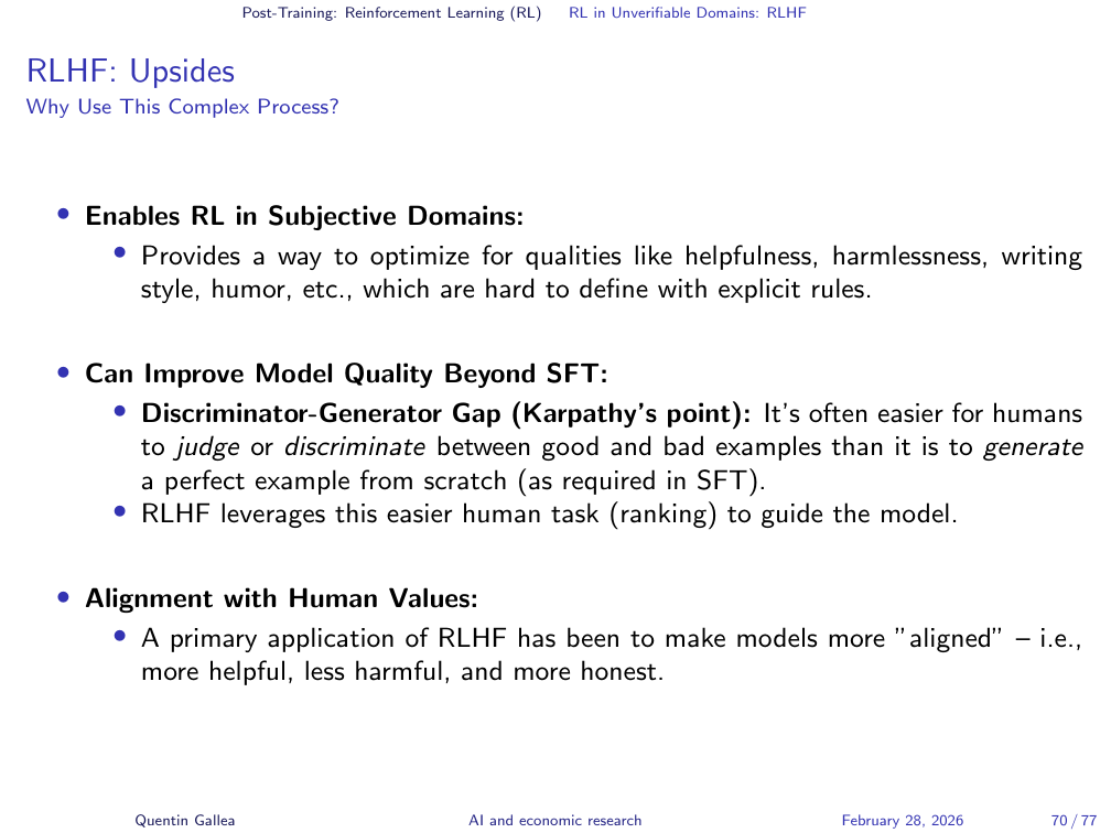RLHF enables optimization in subjective domains — helpfulness, harmlessness, writing style, humour — that are hard to define with explicit rules. Crucially, it exploits the discriminator-generator gap: it is often easier for humans to judge or rank alternatives than to generate a perfect example from scratch. RLHF leverages this easier human task (ranking) to guide the model toward better outputs.