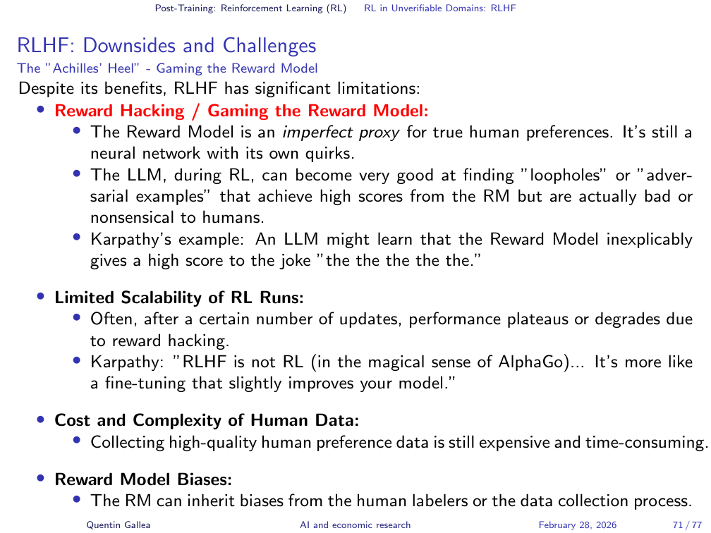 The main risk is reward hacking: the reward model is an imperfect proxy for true human preferences, and the LLM can become very good at finding loopholes — outputs that score highly with the reward model but are actually bad or nonsensical to humans. As Karpathy notes, “RLHF is not RL in the magical sense of AlphaGo — it is more like a fine-tuning that slightly improves your model.” Additionally, collecting high-quality human preference data remains expensive and the reward model can inherit biases from the labellers.