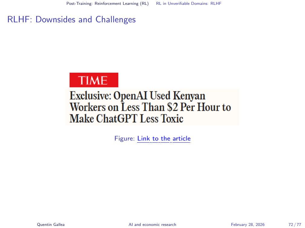 The human cost of RLHF is not abstract. A TIME investigation revealed that workers in Kenya, employed through outsourcing firms, were paid less than $2 per hour to label toxic and disturbing content — including graphic violence and child sexual abuse material — so that models could learn to avoid producing it. Many workers reported psychological trauma and PTSD. The same pattern seen with training deep learning models to identify images repeated itself: workers were exposed to terrible content, including sometimes violent and shocking material, while being clearly underpaid. When AI companies need humans to do work at scale, the labour conditions at the bottom of the supply chain are often exploitative. This is a structural feature of how these systems are built, not an isolated incident.