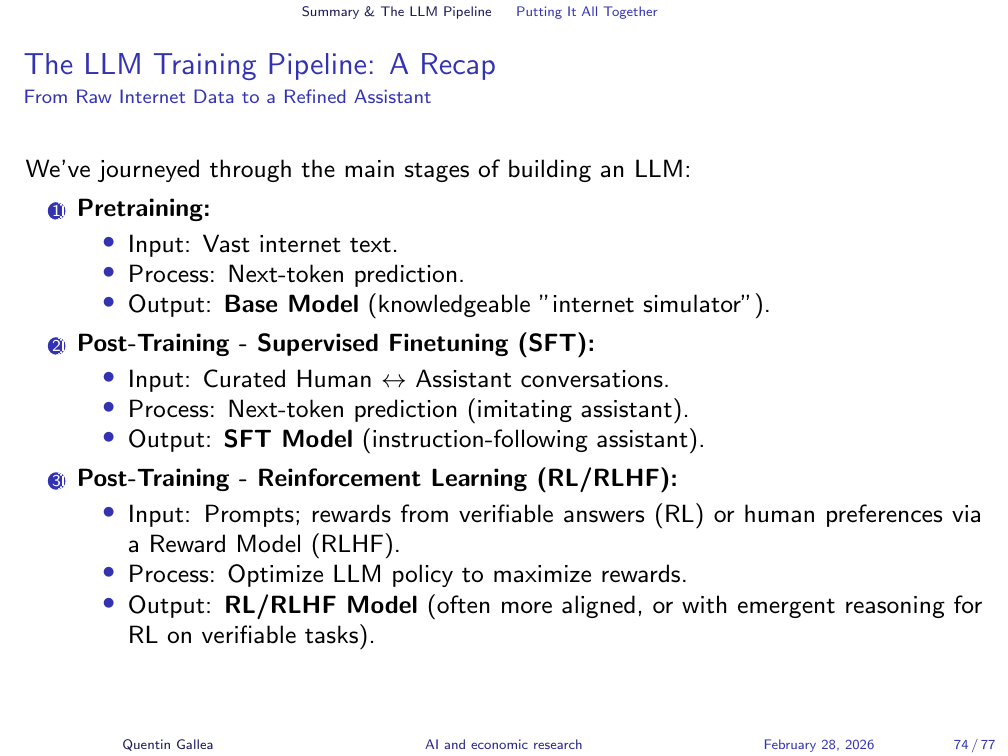 The full pipeline in summary: Pretraining produces a base model — an internet document simulator that can predict text but cannot converse. At this stage, the choice of training data already introduces biases. Supervised finetuning transforms the base model into a conversational assistant by training on structured dialogue. Reinforcement learning pushes beyond human-level imitation — either through verifiable rewards (as in AlphaGo) or through human preference feedback (RLHF). Each stage adds capability and each introduces its own risks and limitations.
