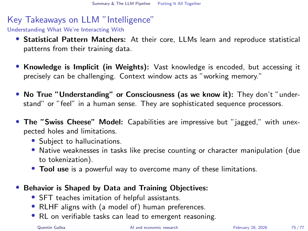 At their core, LLMs are sophisticated statistical pattern matchers. Vast knowledge is encoded implicitly in their weights, but accessing it precisely can be unreliable — the context window acts as “working memory” for reliable recall. They do not “understand” or “feel” in a human sense. Their capabilities are impressive but jagged, with unexpected holes (hallucinations, character-level tasks) that tool use can overcome. Behaviour is shaped entirely by data and training objectives: SFT teaches imitation, RLHF aligns with preferences, and RL on verifiable tasks can lead to emergent reasoning.