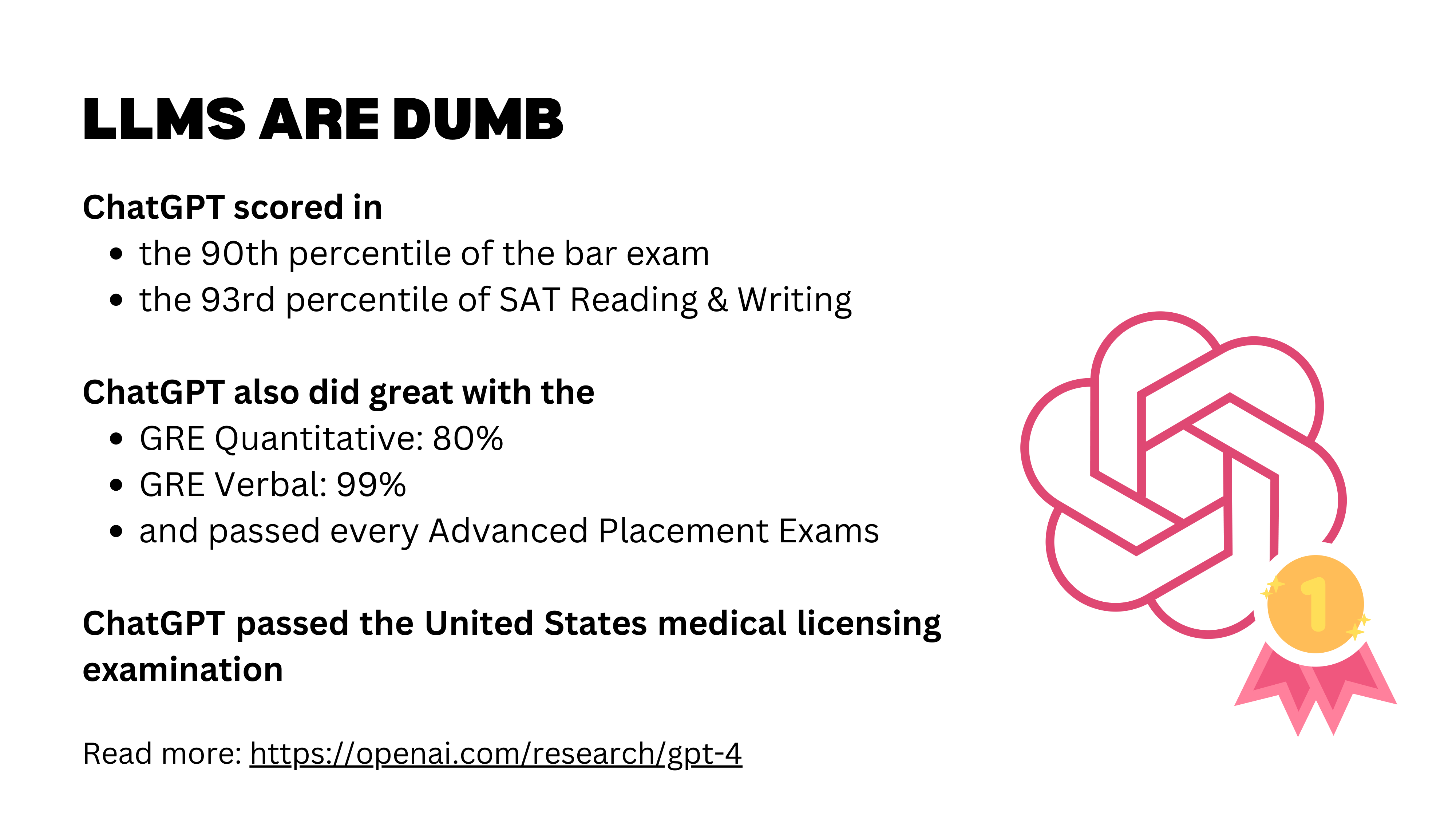 One way humans measure intelligence is through difficult exams. LLMs perform well on the bar exam, the medical licensing exam, math competitions, and many other professional benchmarks. What is truly remarkable is not any single score, but the breadth: a human who passes the bar exam is unlikely to also excel at the medical licensing exam and a graduate math test. LLMs can do well across all of them simultaneously.