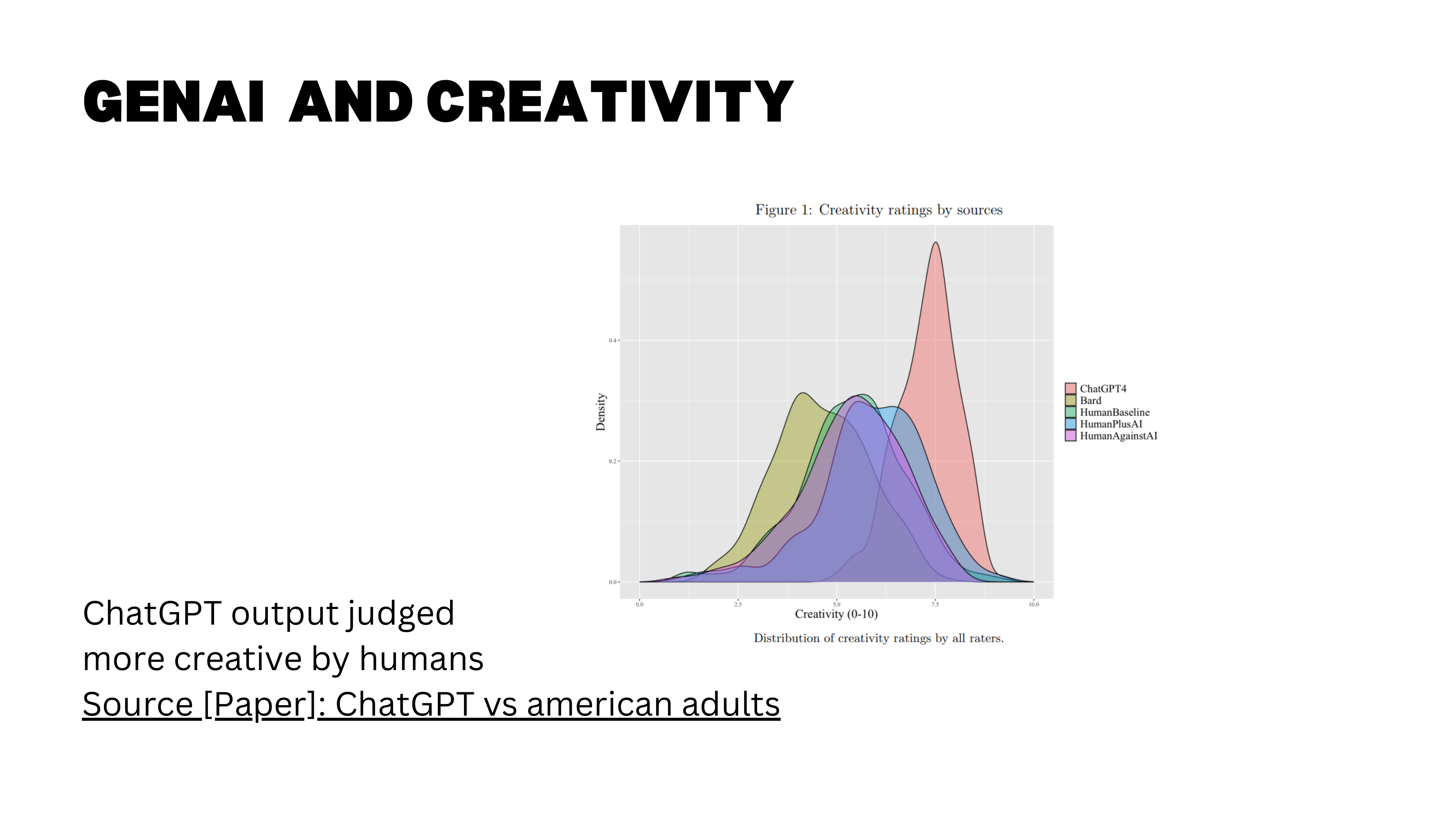 Interestingly, the human-plus-AI condition did not reach the same creativity level as full AI output — the authors conjecture that prompting drives this result, since they directly asked ChatGPT to produce creative and novel answers.