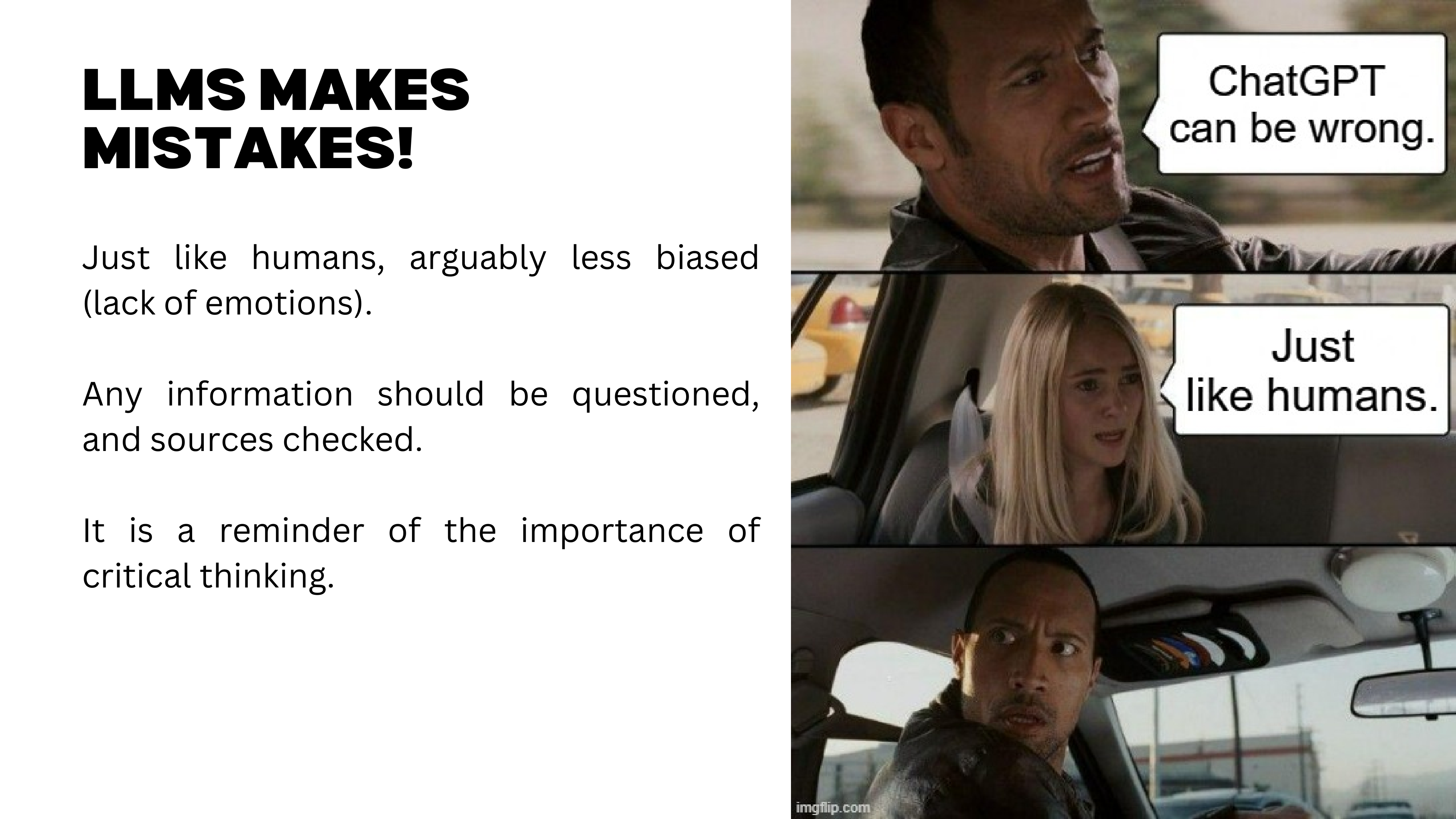 The right framing is not “LLMs make mistakes, therefore they are useless” but rather: what types of mistakes do they make, and are those mistakes better or worse than human mistakes? Humans have agendas, emotions, and incentives to deceive. LLMs have different failure modes — hallucination, pattern-matching errors, silent fabrication. The question is comparative: when you hire a research assistant, you expect mistakes and you double-check. The same applies to an LLM.