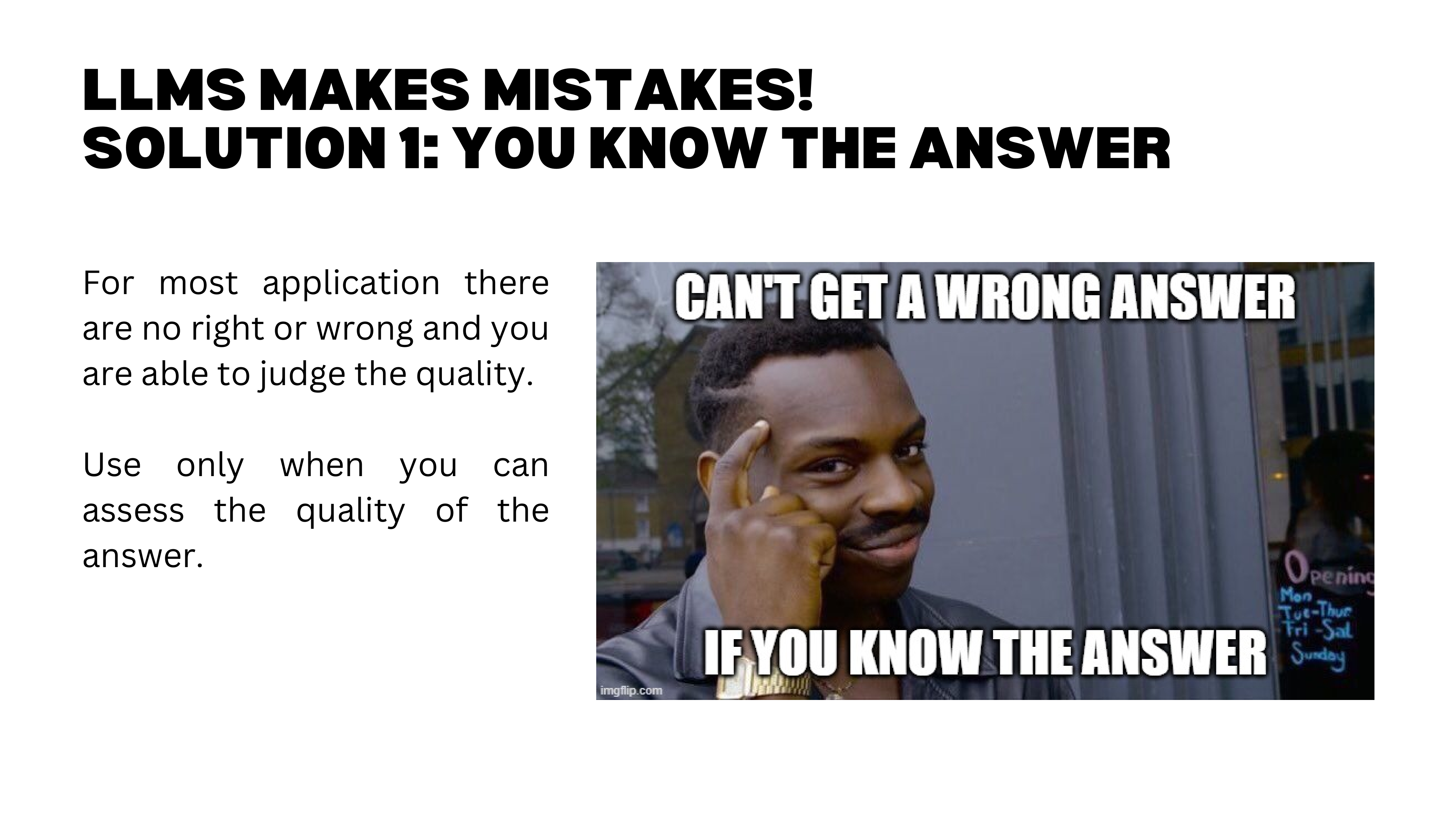 The first solution is to recognize that many tasks have no ground truth. If you are brainstorming paper titles, there is no “right” answer — you get suggestions, keep the good ones, discard the rest. In these cases, the concept of “mistakes” barely applies.