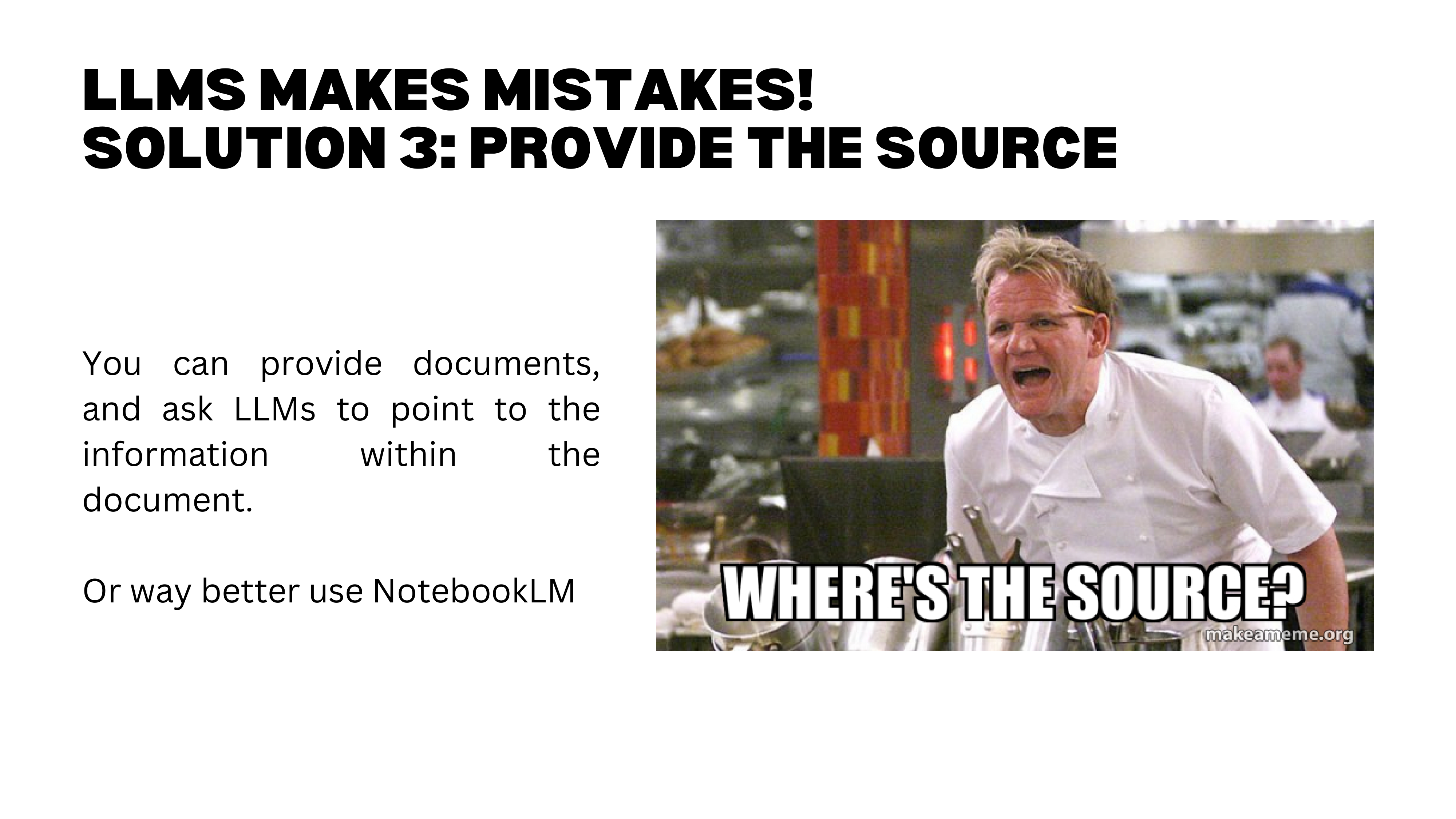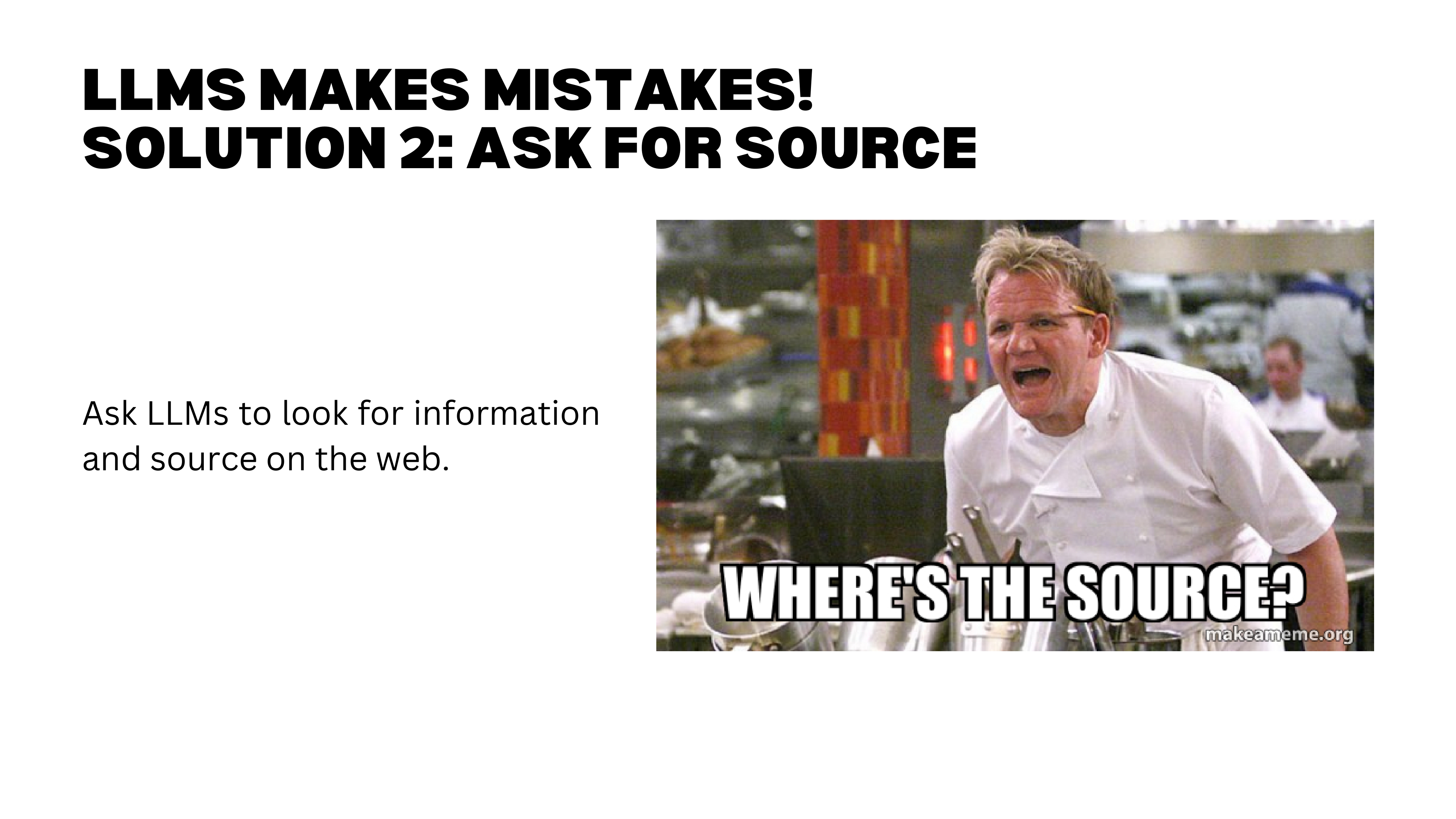 The second solution: ask for sources and verify them. When an LLM cites a paper or statistic, check that it actually exists and says what the model claims.