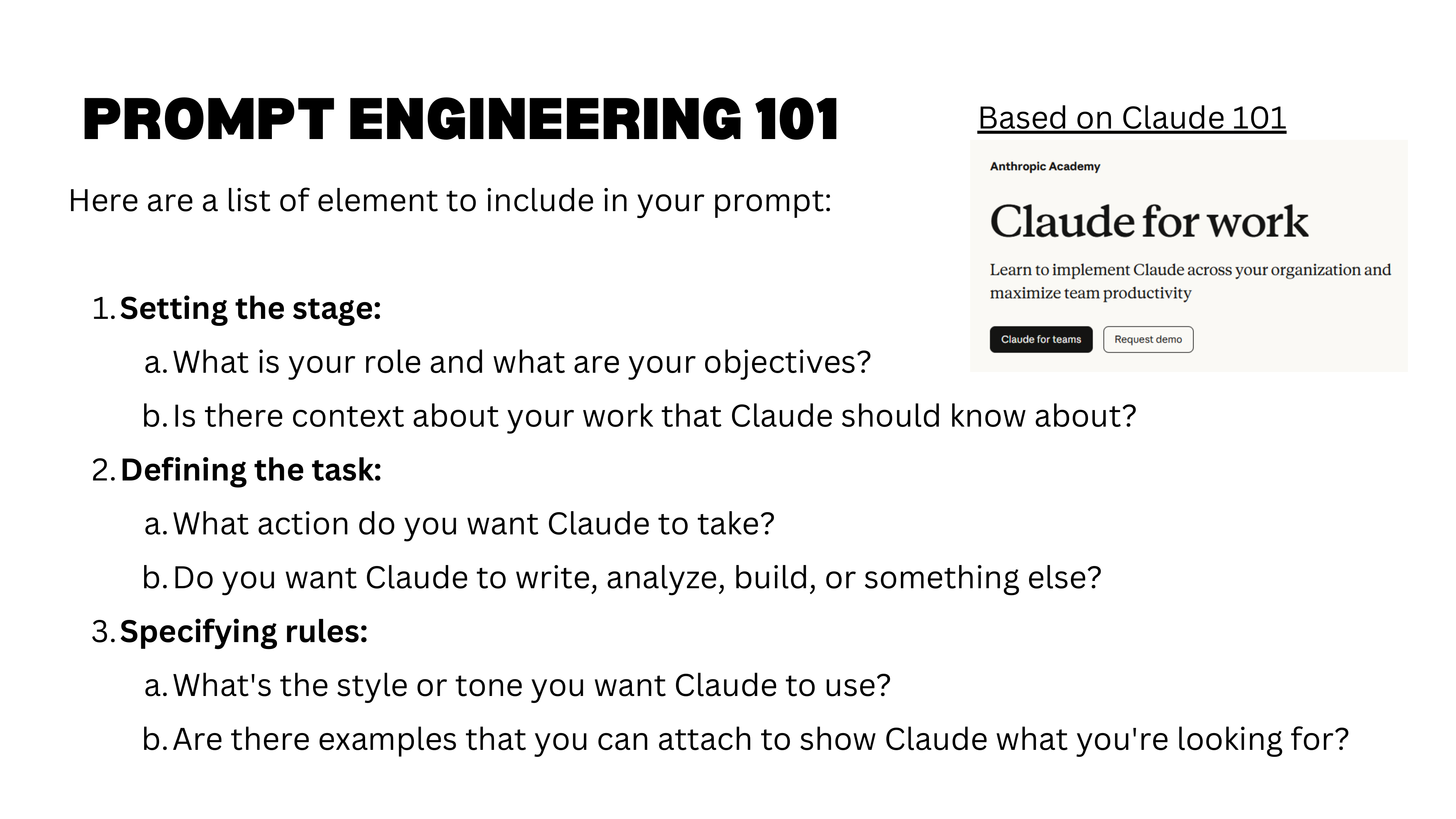 While we have moved well beyond “just prompting,” the fundamentals still matter. Anthropic’s Claude 101 tutorial distills effective prompting into three elements: