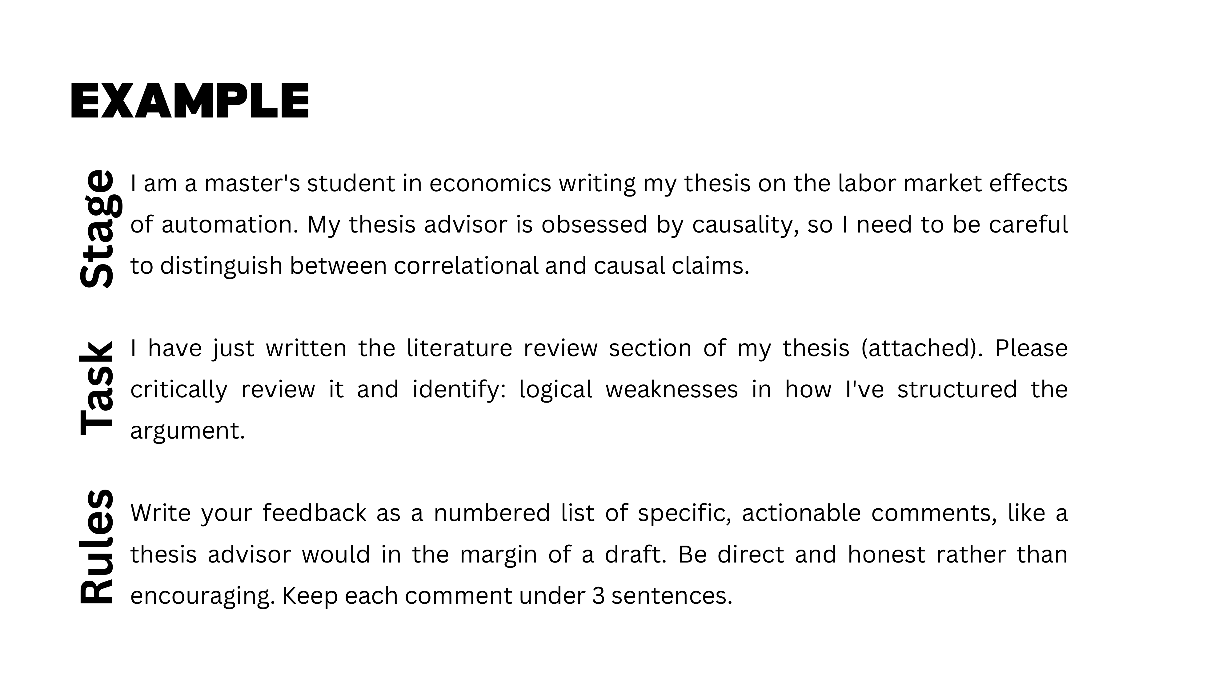 Here is a concrete example. Context: “I am a master’s student in economics writing a thesis on labor market effects of automation. My thesis advisor is obsessed with causality, so I need to distinguish carefully between correlation and causation.” This framing adjusts the model’s tone, technicality, and emphasis — subtle but powerful.