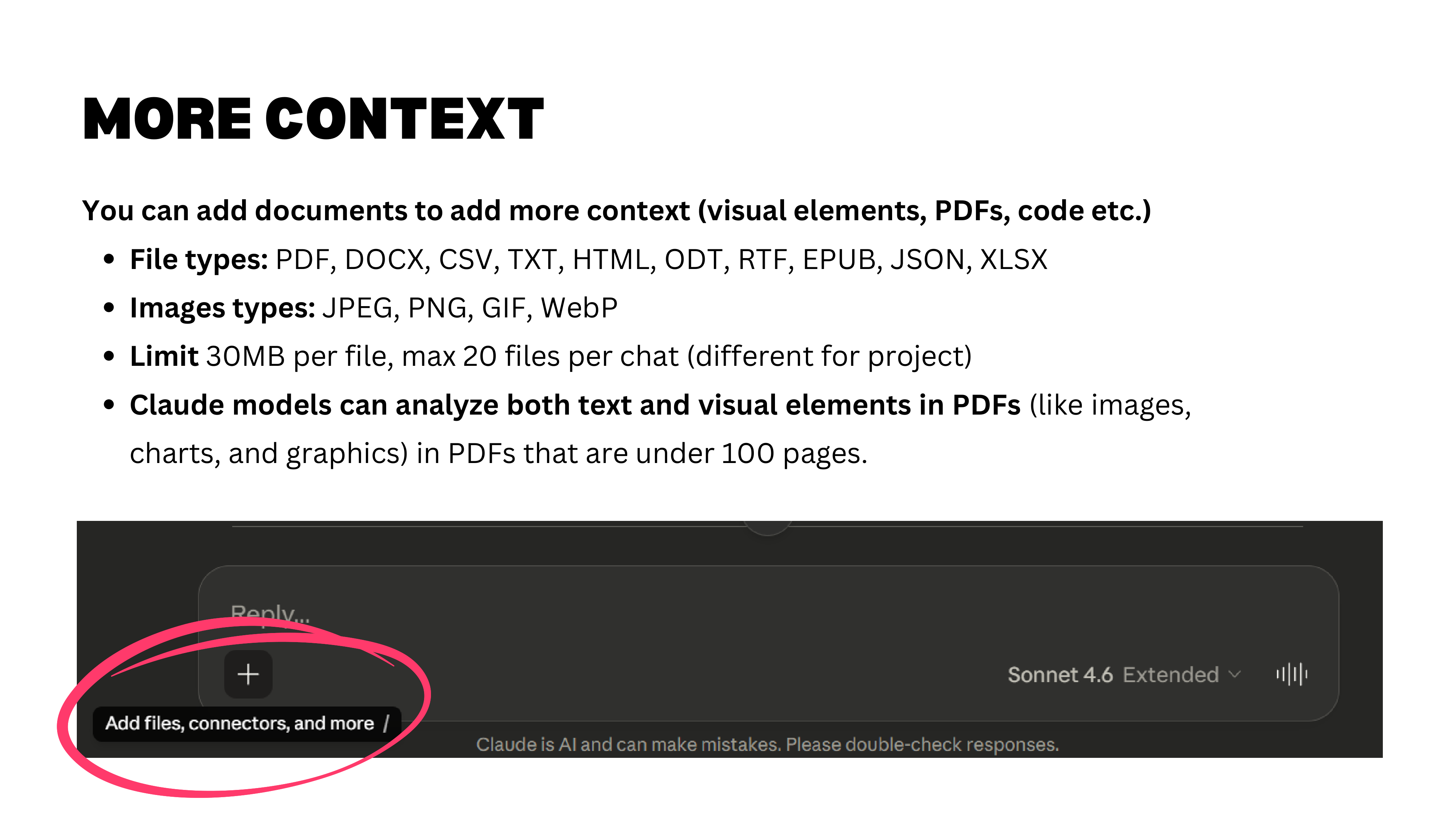 Claude accepts many file types: images, text, PDFs, spreadsheets. For PDFs of up to 100 pages, the model reads both text and visual elements (charts, graphics, diagrams) by splitting each page into an image and analyzing it visually.