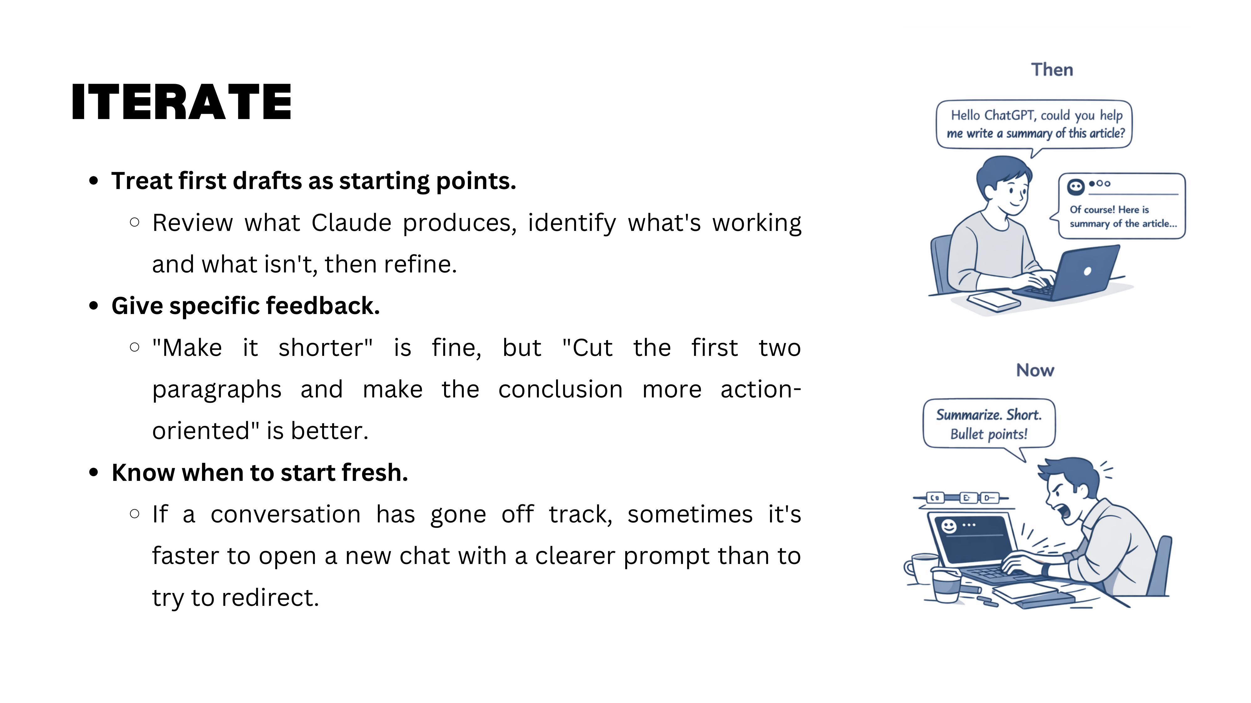 The most important iteration rule: be specific with feedback. “Make it shorter” is vague and leads to frustrating loops where the model cuts the wrong parts. Instead: “Cut the first two paragraphs, expand the conclusion, keep the methodology section unchanged.” Specificity saves time.