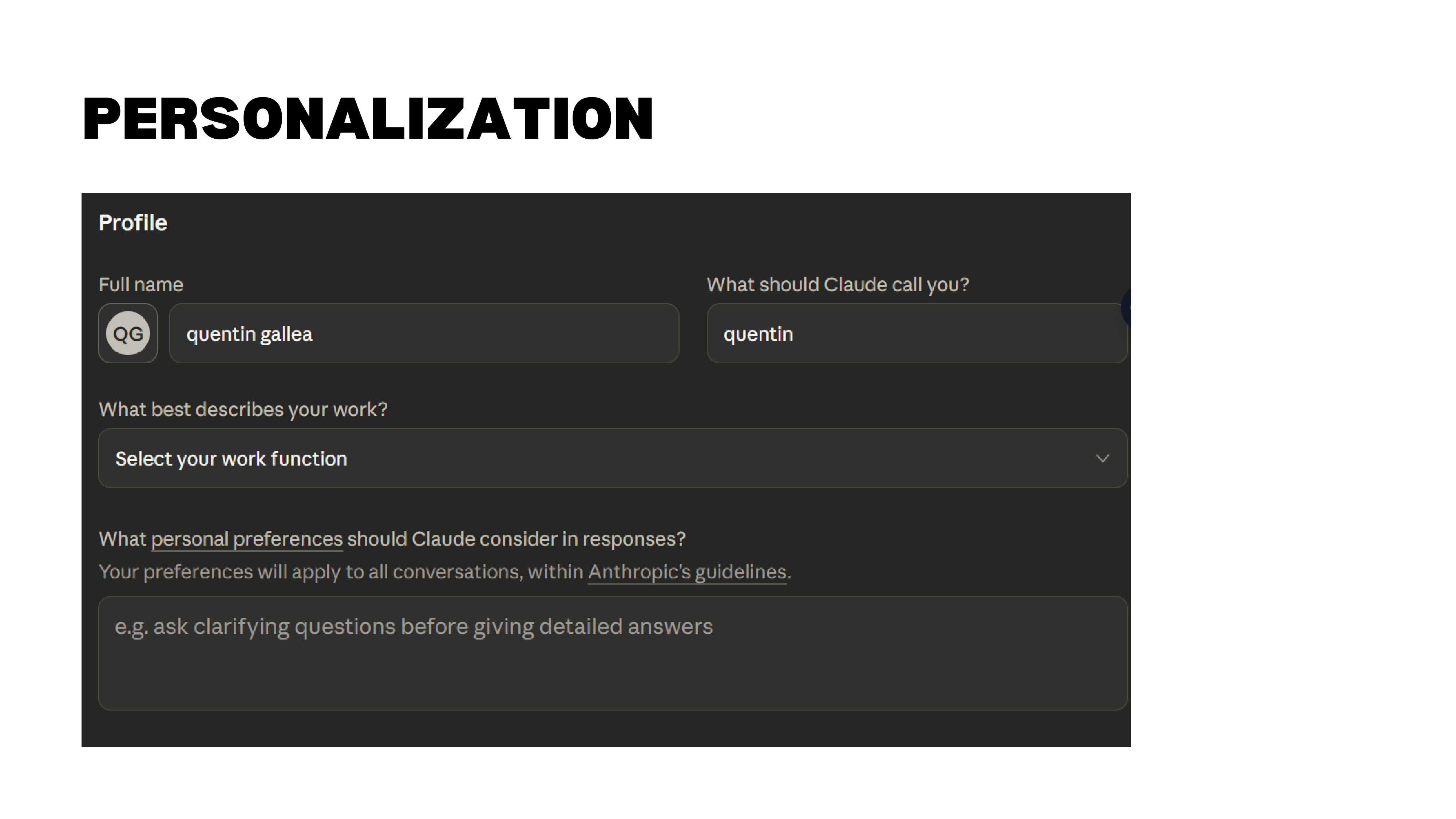 Claude allows you to set persistent personalization — general information about yourself, your role, and your preferences that the model carries across all conversations. In addition, you can enable memory from chat history, so Claude remembers what you have been working on across different sessions.
