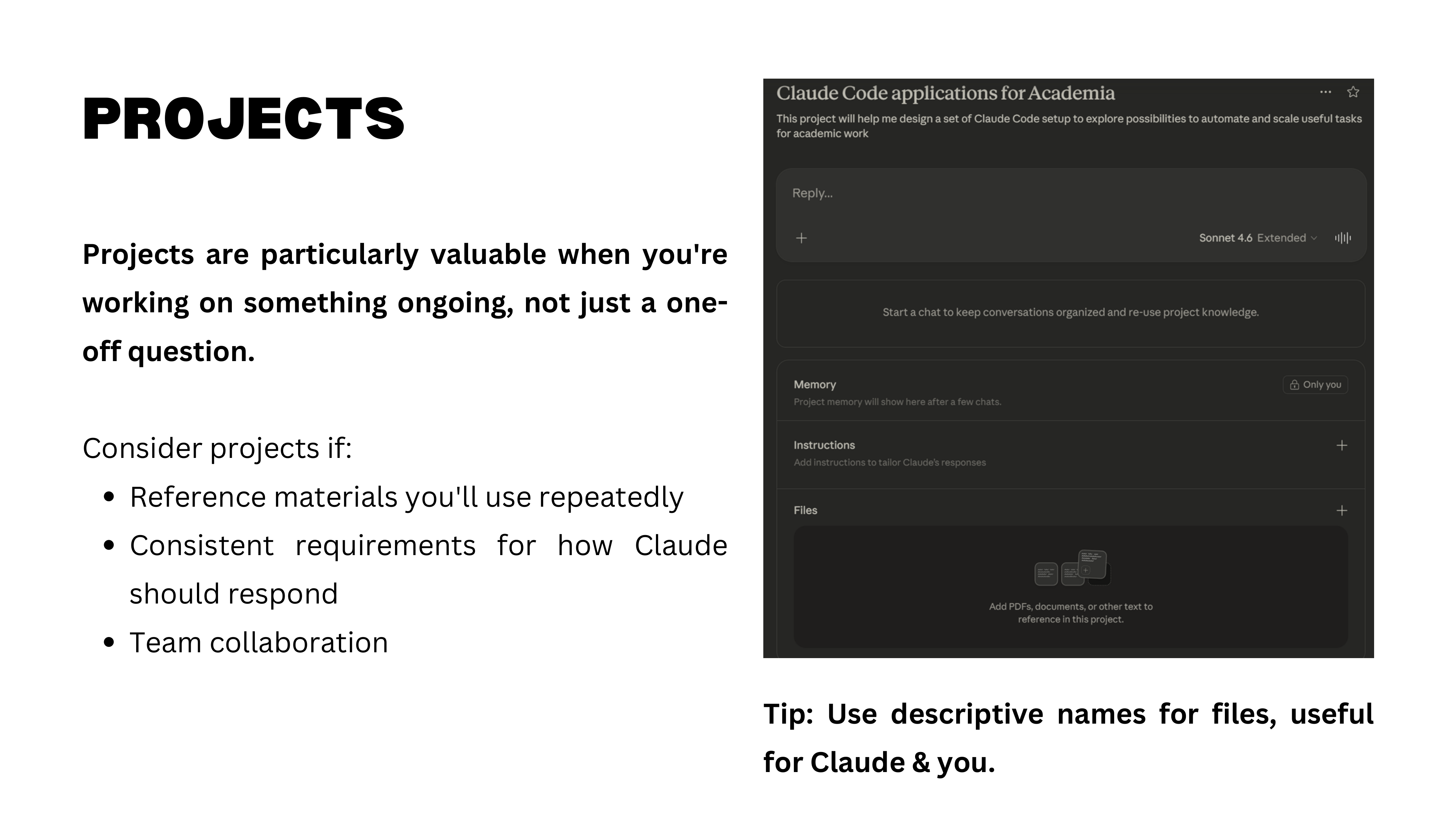 Key insight: Name your project files as if a new research assistant is joining your team — clear, descriptive names help Claude (and future you) find the right document.