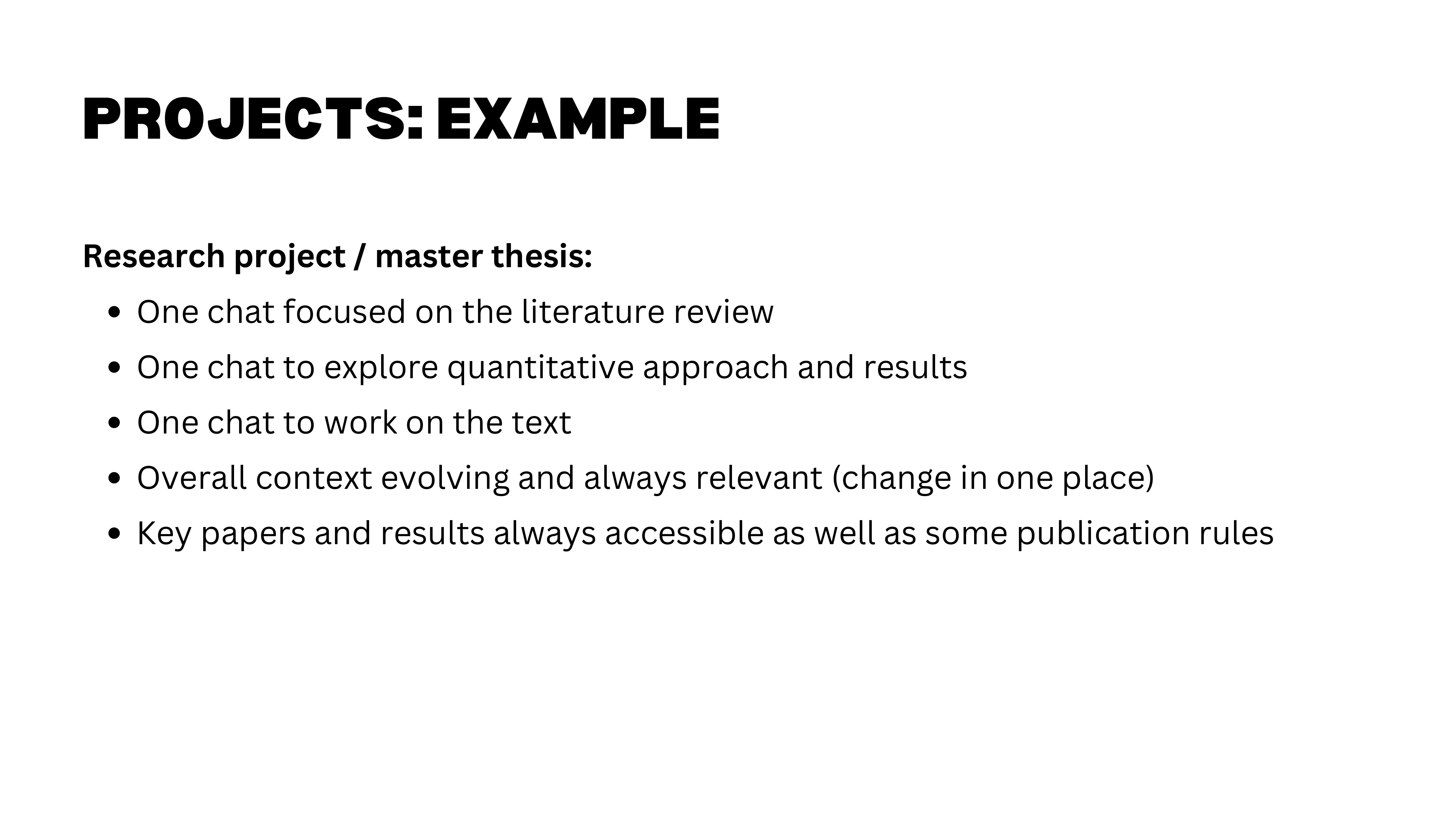 A natural use case: a master’s thesis project. Upload your key papers, your data description, and your research goals. Then create separate chats within the project for different workstreams — literature review, econometric approach, writing — all sharing the same knowledge base. You never have to re-explain your research question or re-upload your references. Each chat has full access to everything in the project.