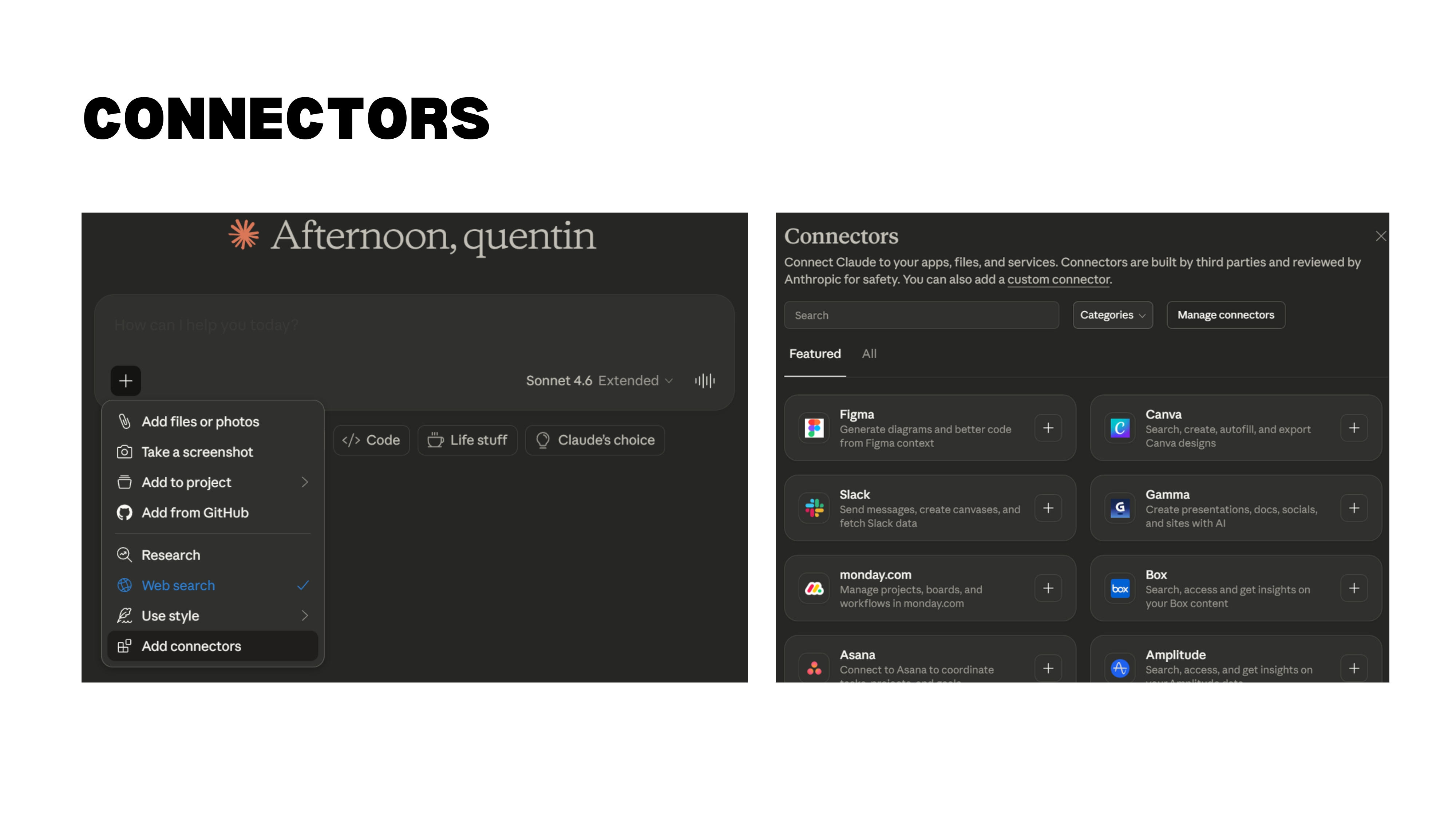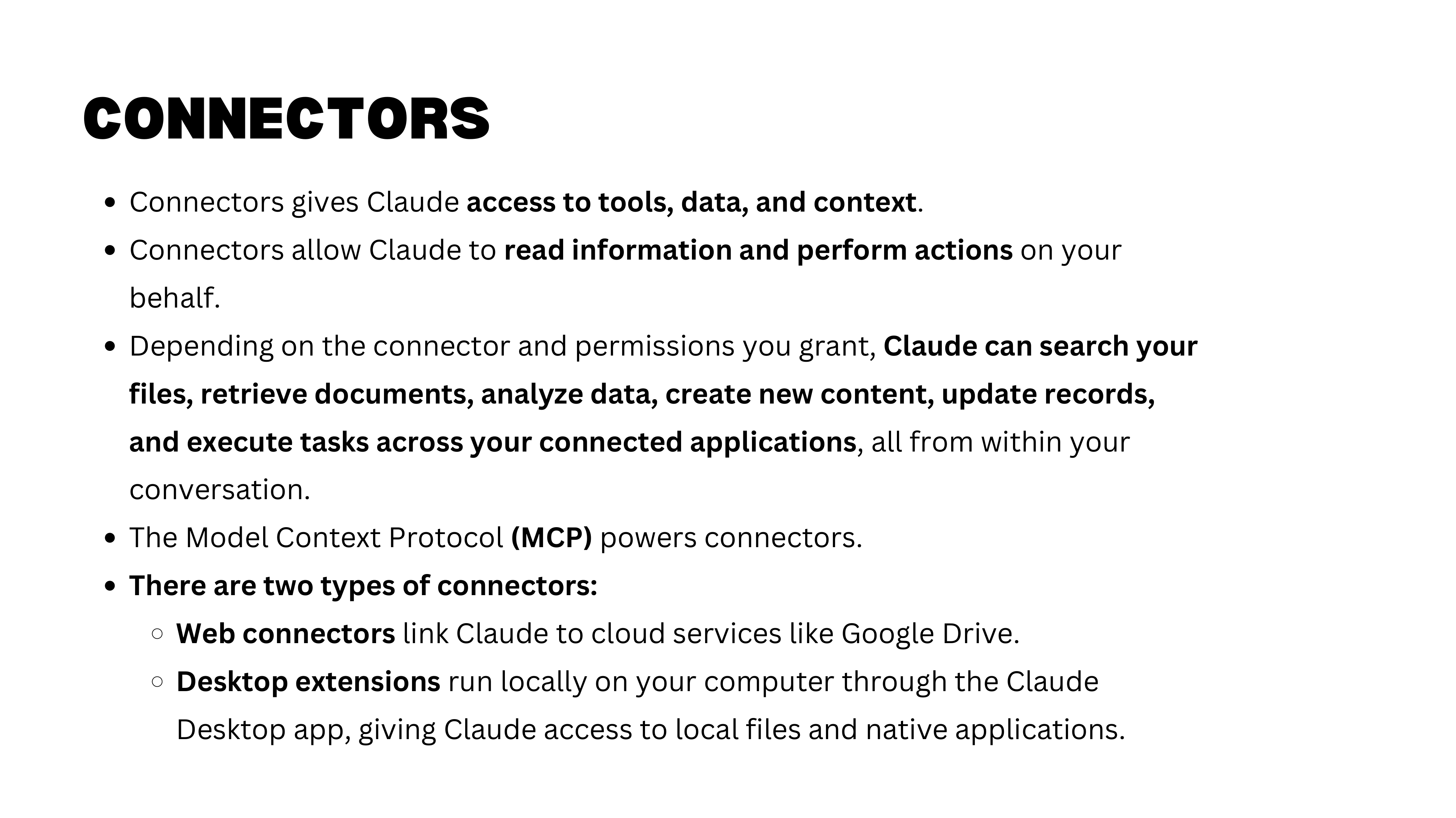 Connectors let Claude access external tools, data sources, and applications. You can connect to Notion (to read and update task lists), Slack (to send messages), email, and many other services. The desktop extension lets Claude interact directly with your computer, further expanding what is possible.