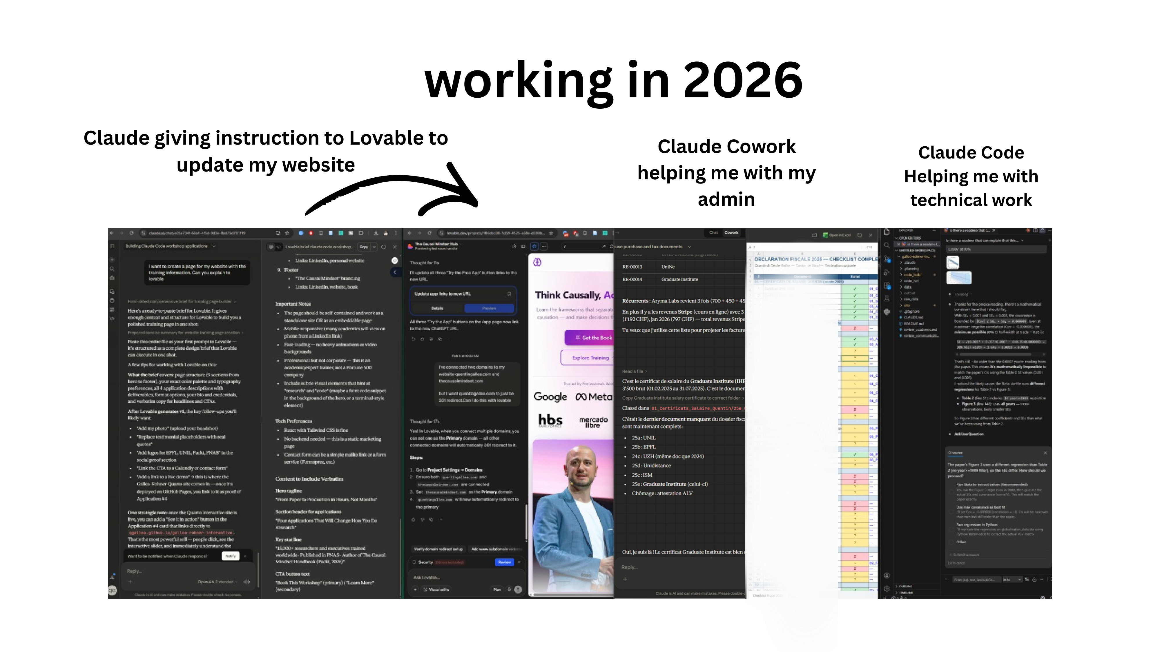 Here is a snapshot of a typical Sunday evening. Four AI agents running simultaneously: Claude open in the browser, Claude Code instructing Lovable (a vibe-coding app) to generate a website page, Claude Cowork preparing a tax report, and another Cowork instance creating the research paper website discussed earlier. All running in parallel while drinking tea and reading the progress logs.
