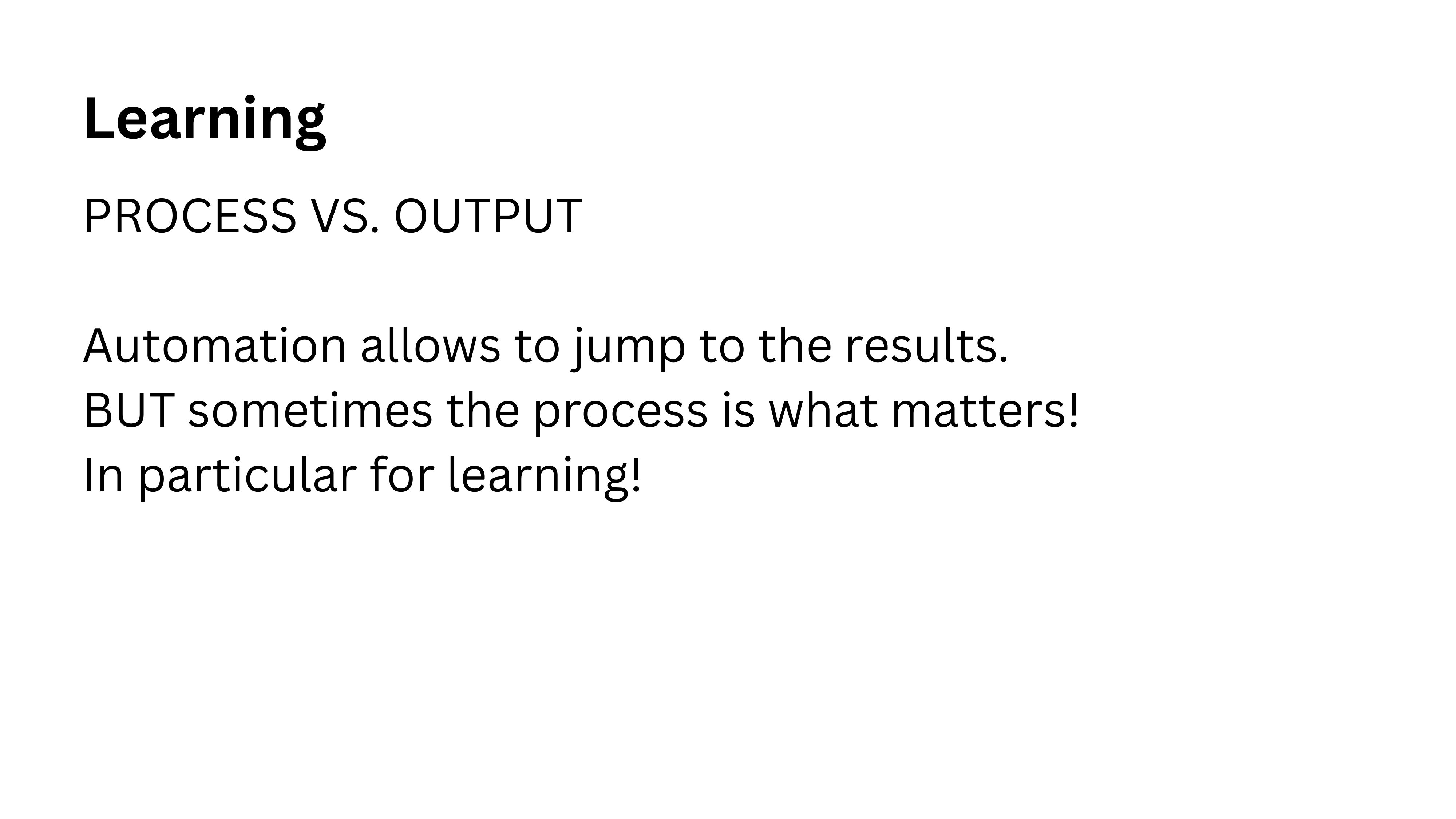 Once you have acquired expertise, some tasks shift to being output-focused. A senior researcher writing their tenth paper may reasonably automate parts of the execution. But at the learning stage, the process is what matters.
