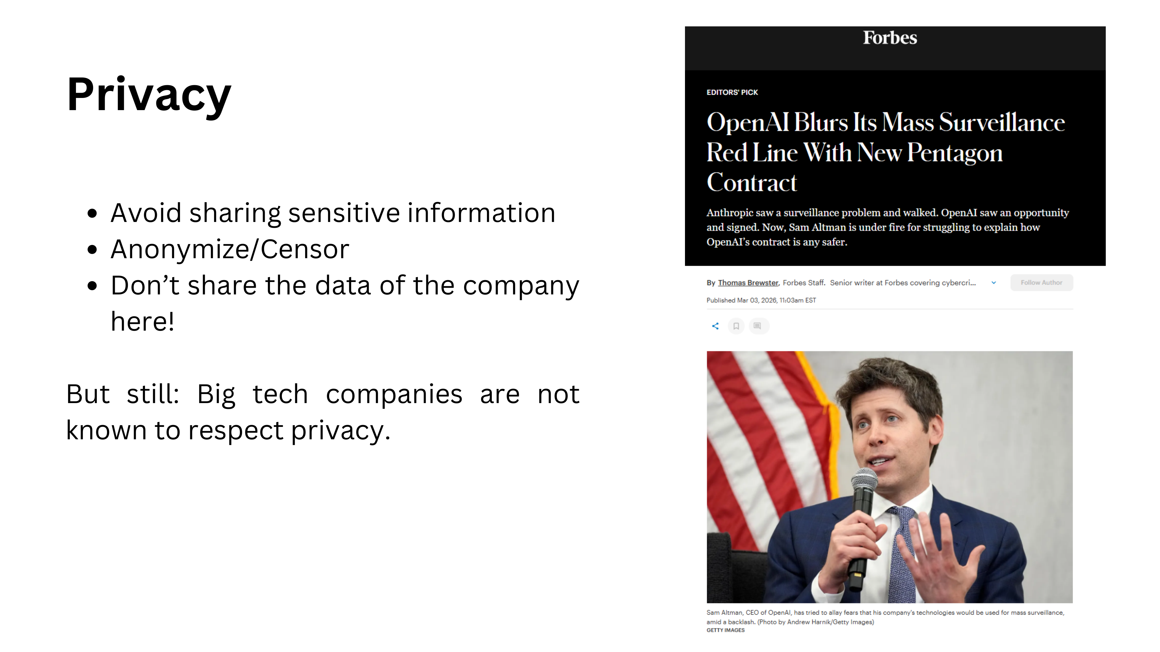 Privacy remains a serious concern. The creators of frontier models are large US tech companies not historically known for protecting user privacy. OpenAI’s recent contract with the US Department of Defense underscores this tension. When you type sensitive information into an LLM, consider where that data goes and who can access it.