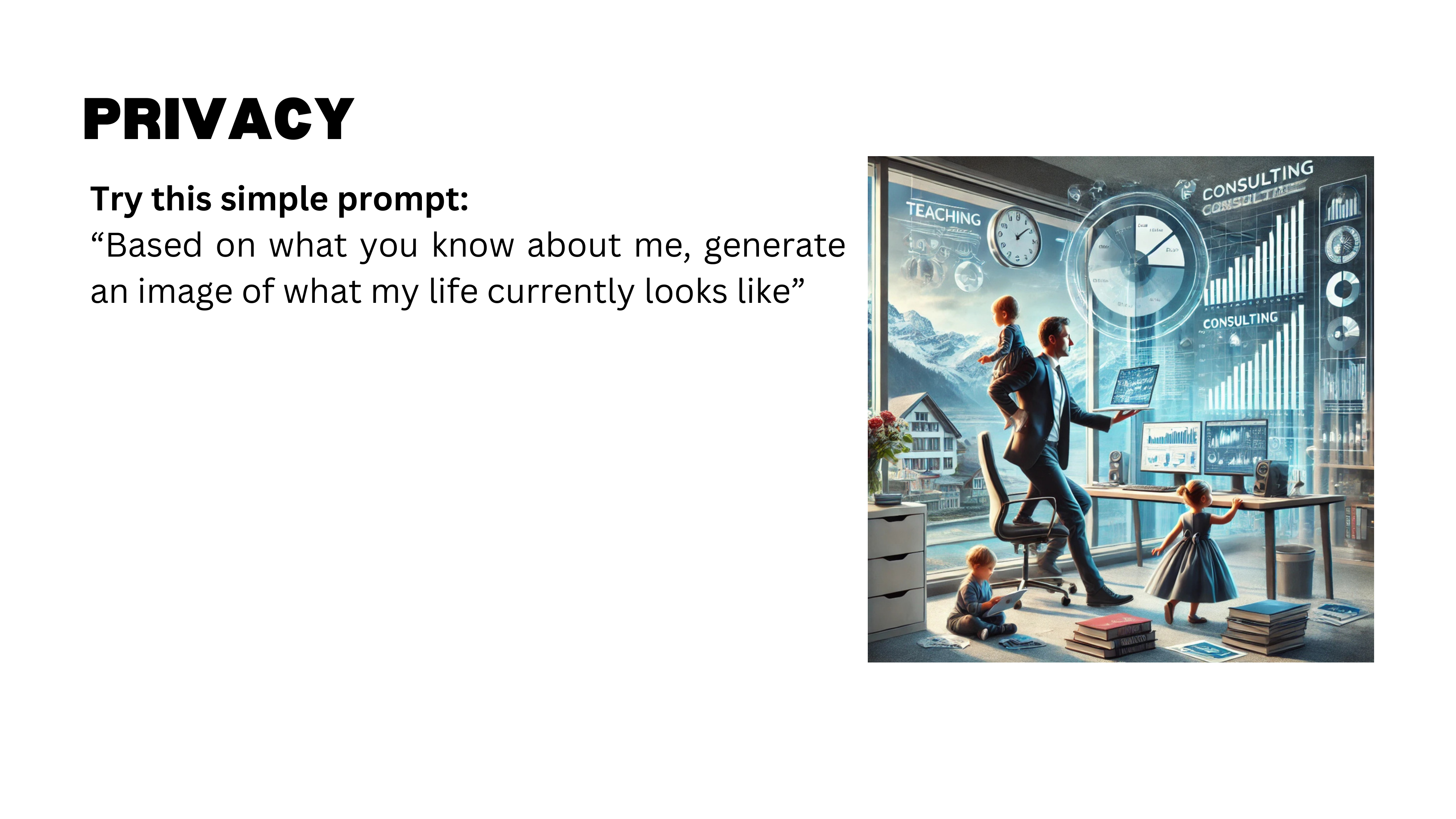 A lighter illustration of how much these models know about you: ask Claude or ChatGPT to “generate an image of what my current life looks like based on what you know about me.” The results can be surprisingly accurate — roughly correct ages of family members, professional activities like teaching and consulting, and a distinctly Swiss-looking background. Though the model also added an extra child that does not exist — perhaps a prediction, perhaps just a mistake.