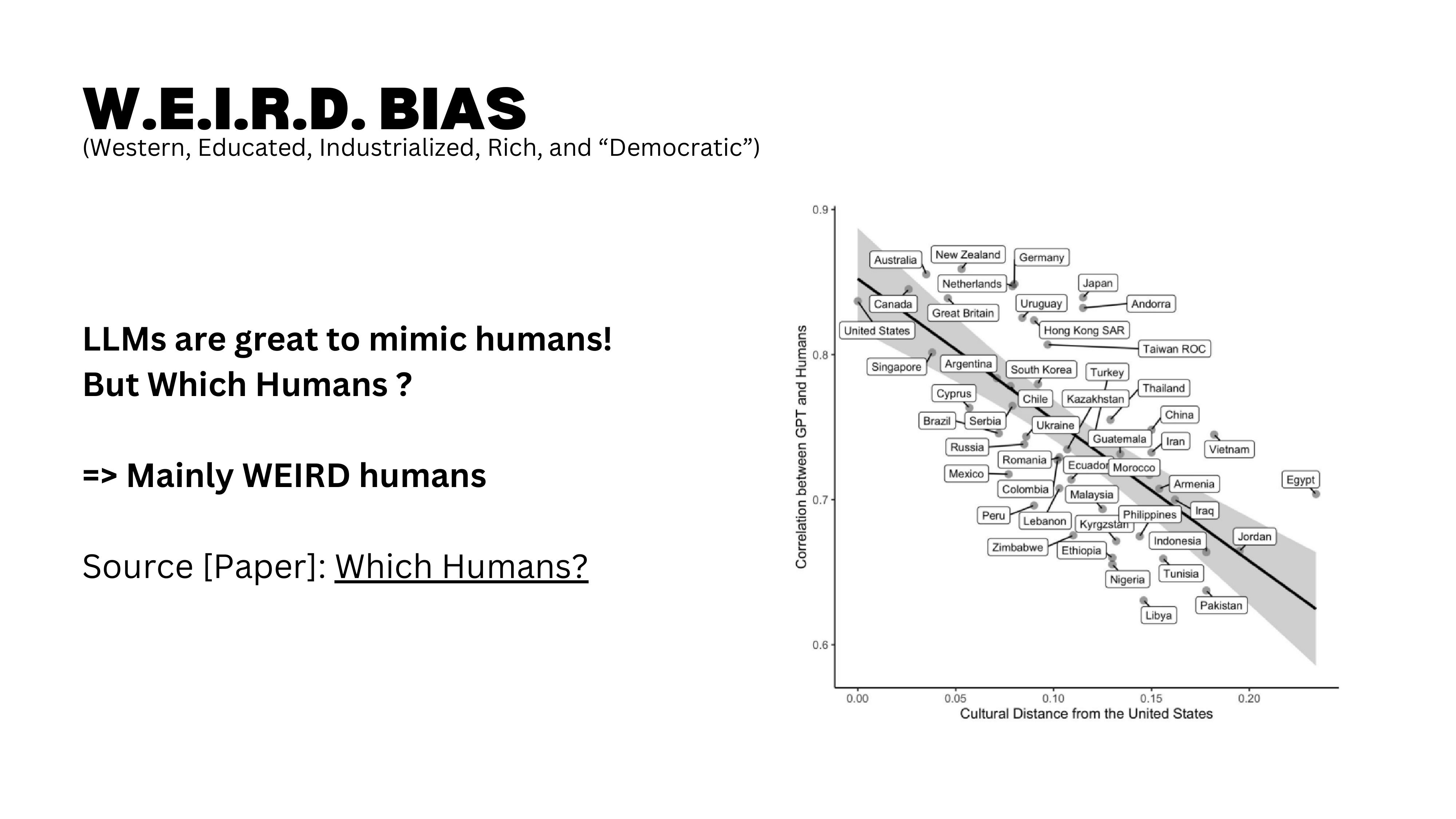 LLMs exhibit W.E.I.R.D. bias — they over-represent the worldview of Western, Educated, Industrialized, Rich, and Democratic societies. The training data skews heavily toward English-language, Western sources. If you value diversity of perspective — and you should — this is a systematic limitation to keep in mind.