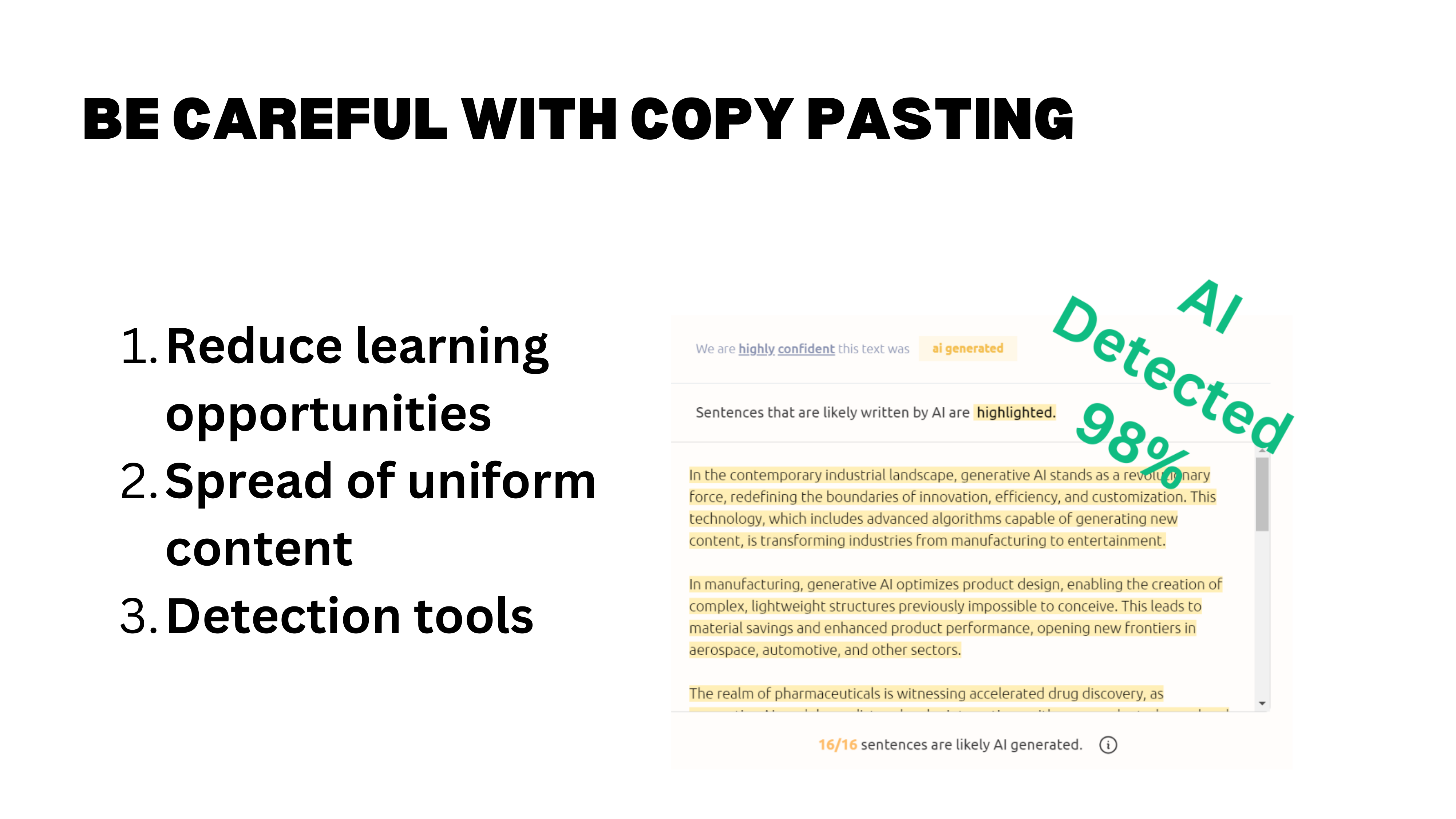 Beyond detection risk, copy-pasting AI output directly reduces your learning opportunities, makes your content uniform and indistinguishable from everyone else’s, and forfeits the chance to develop your own voice.