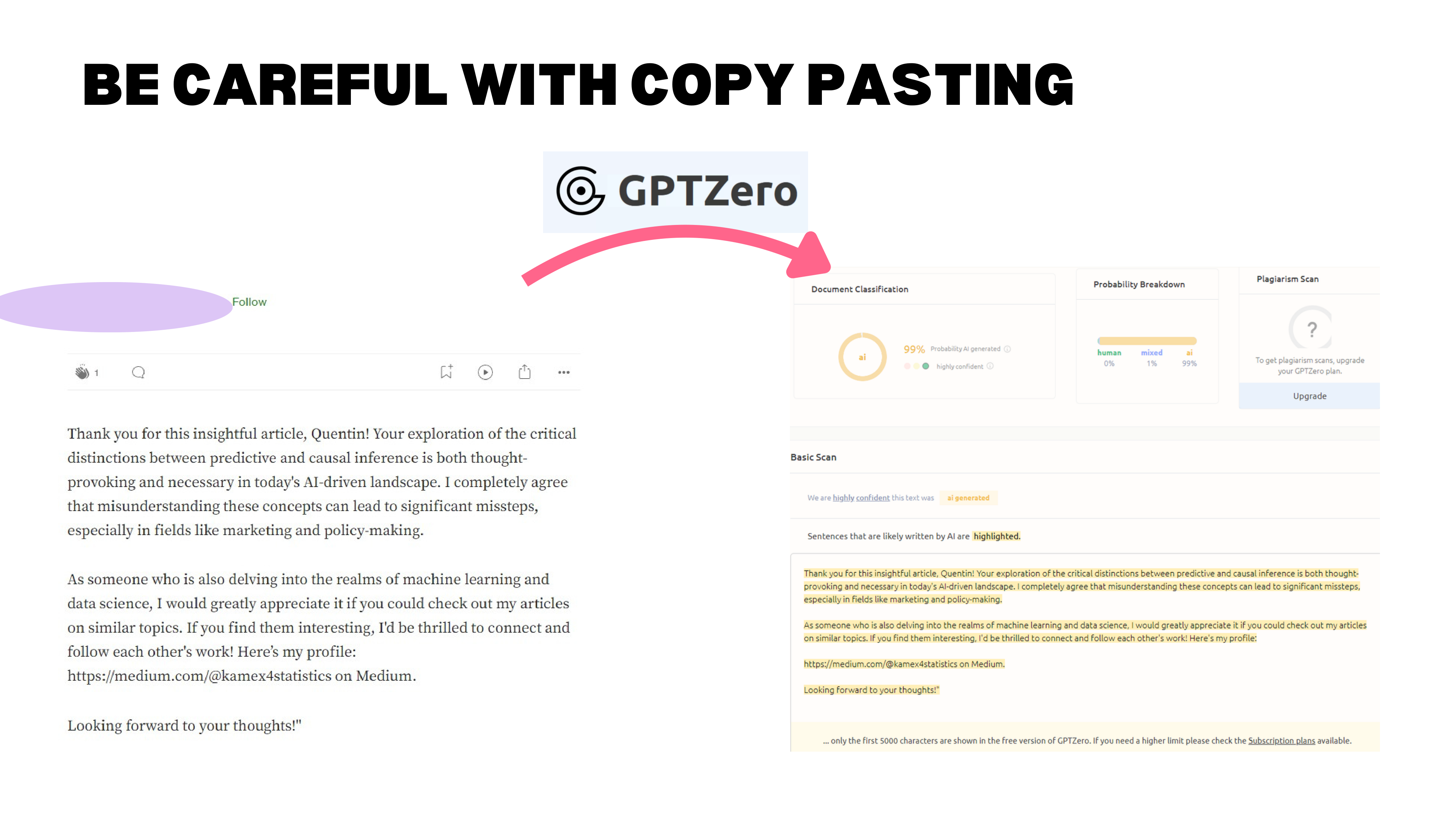 A real example: someone commented on a LinkedIn article with “Thank you for this insightful article, Quentin. Your exploration of the critical distinction between…” — flagged at 99% AI-generated by GPTZero. The comment even had a stray quotation mark at the end, a remnant of the copy-paste from ChatGPT. The person deleted their comment after being called out.
